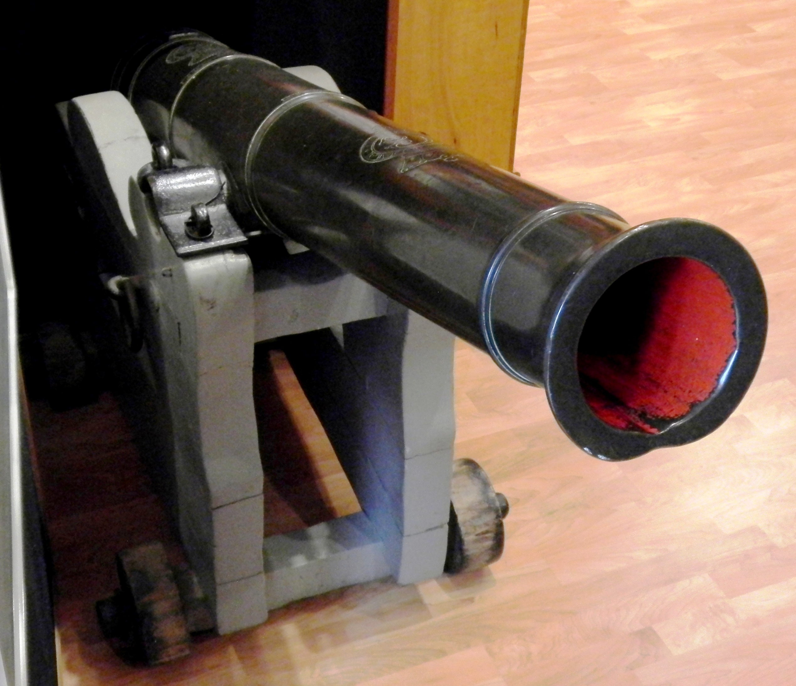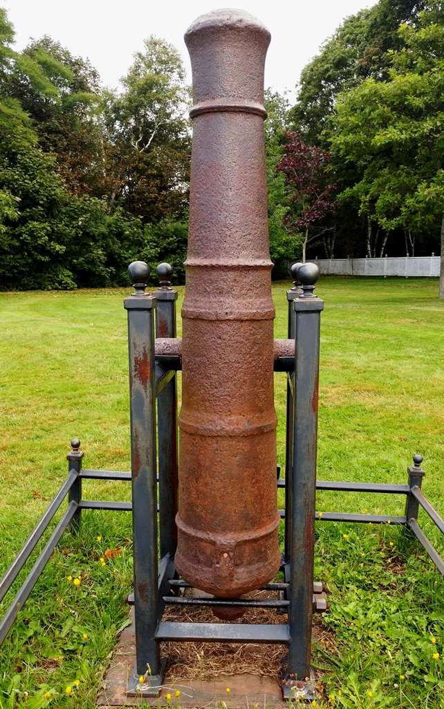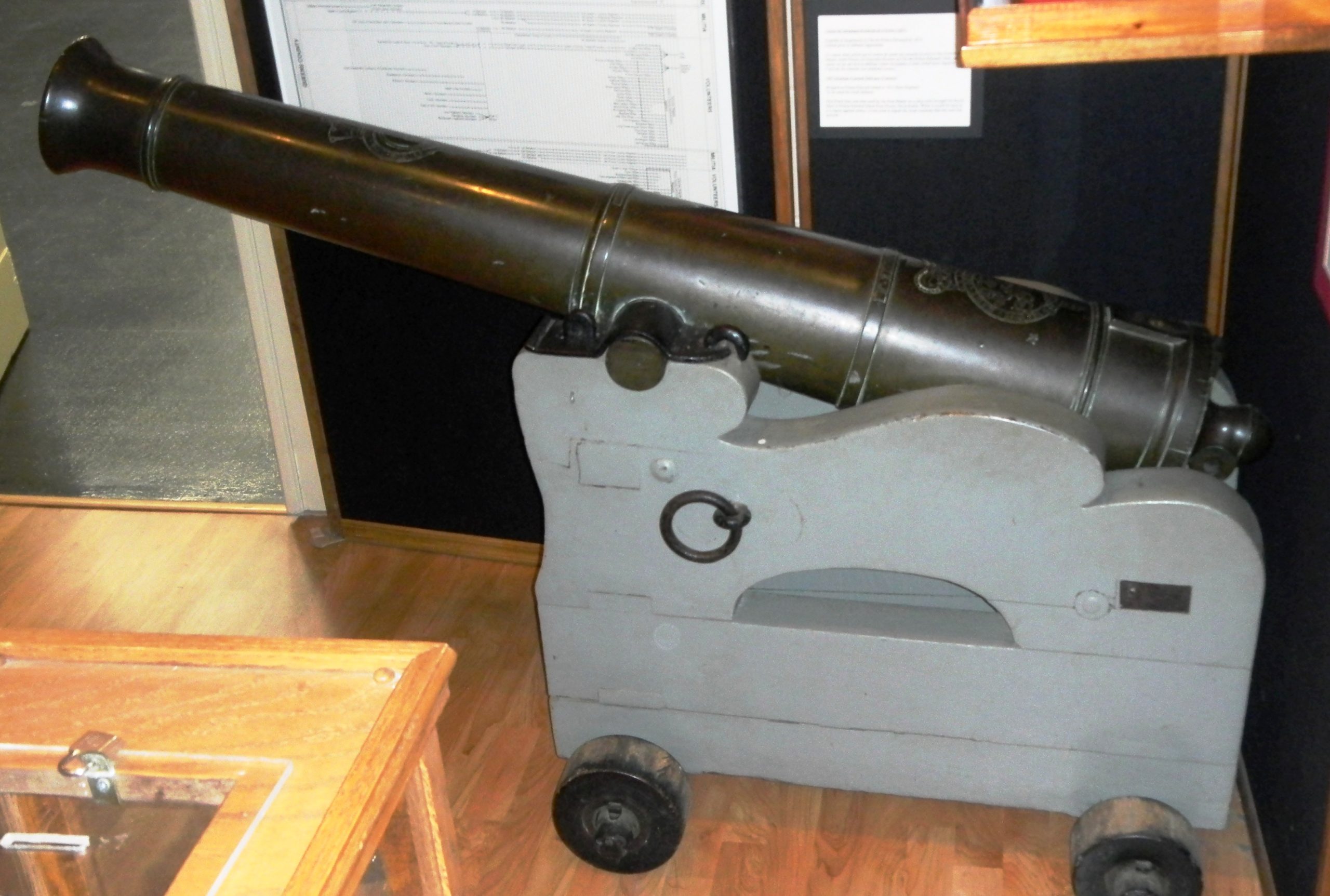 Bronze 6-pounder 6-cwt Smoothbore Muzzleloading Gun, weight 5-3-21 (665 lbs), 1807, Kinman, King George III cypher. This Gun was shipped to PEI in 1812 from England, to be used for local defence. Mounted on a wooden stand. The gun was used by the Post Master on a ship which brought the Royal Mail to PEI from Pictou, Nova Scotia. While it could be used as a weapon against piracy, it was used to signal the local residents that the mail had arrived. Inside the museum.