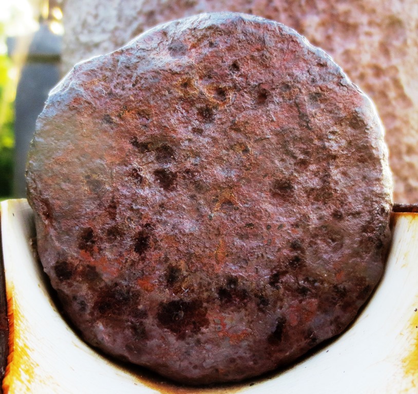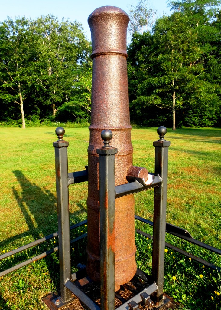 Cast Iron possible 4-pounder Smoothbore Muzzleloading Gun, heavily corroded, no visible markings, 3 & 1/8-inch bore, mounted vertically as a survey marker located NW in Victoria Park.