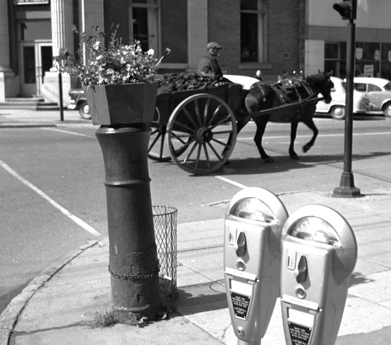 Possible 24-pounder Smoothbore Muzzleloading Gun serving as a bollard at the intersection of Queen Street and Richmond Street in 1958.