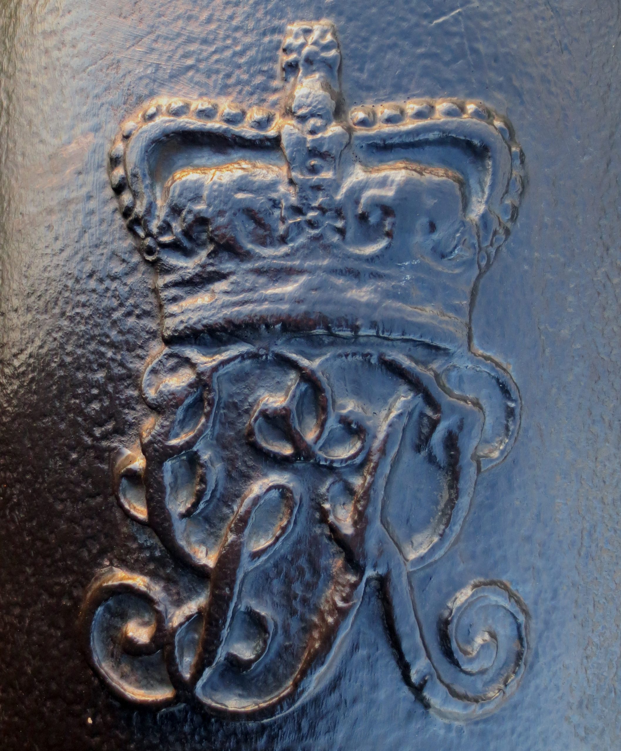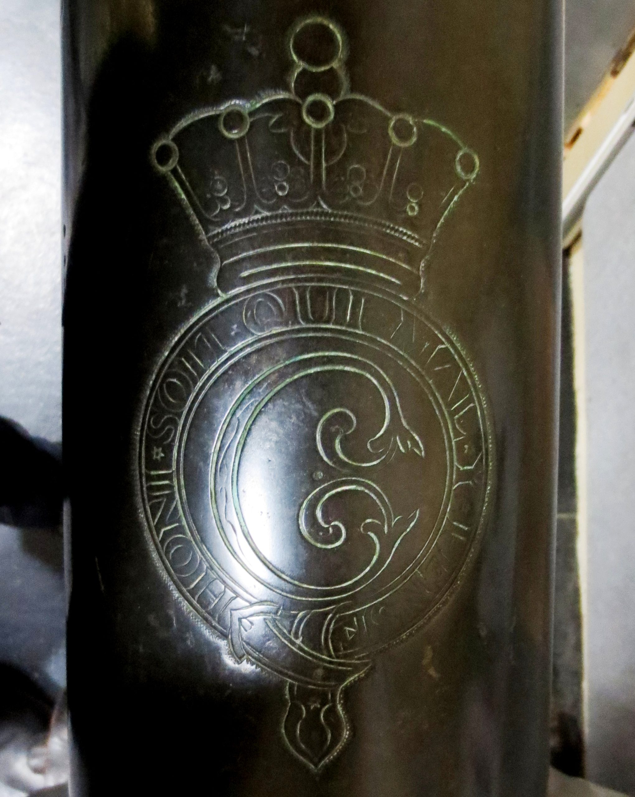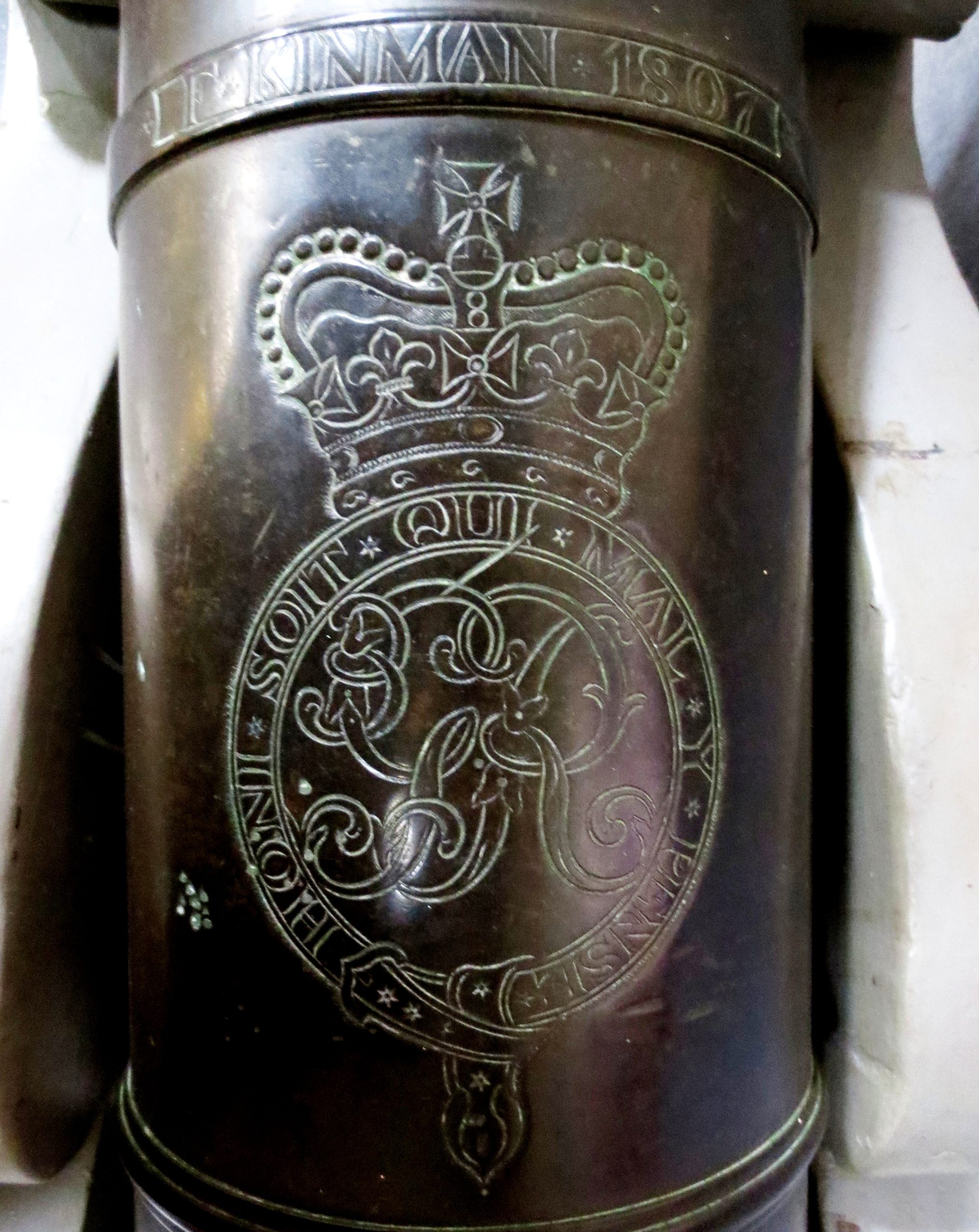 Master-General of the Ordnance (MGO) cypher impressed on top of the bronze gun above the King George 3 cycpher. This was a very senior British military position from 1415 to 2013 (except 1855-1895 and 1939-1958) with some changes to the name, usually held by a serving general. The Master-General of the Ordnance was responsible for all British artillery, engineers, fortifications, military supplies, transport, field hospitals and much else, and was not subordinate to the commander-in-chief of the British military.