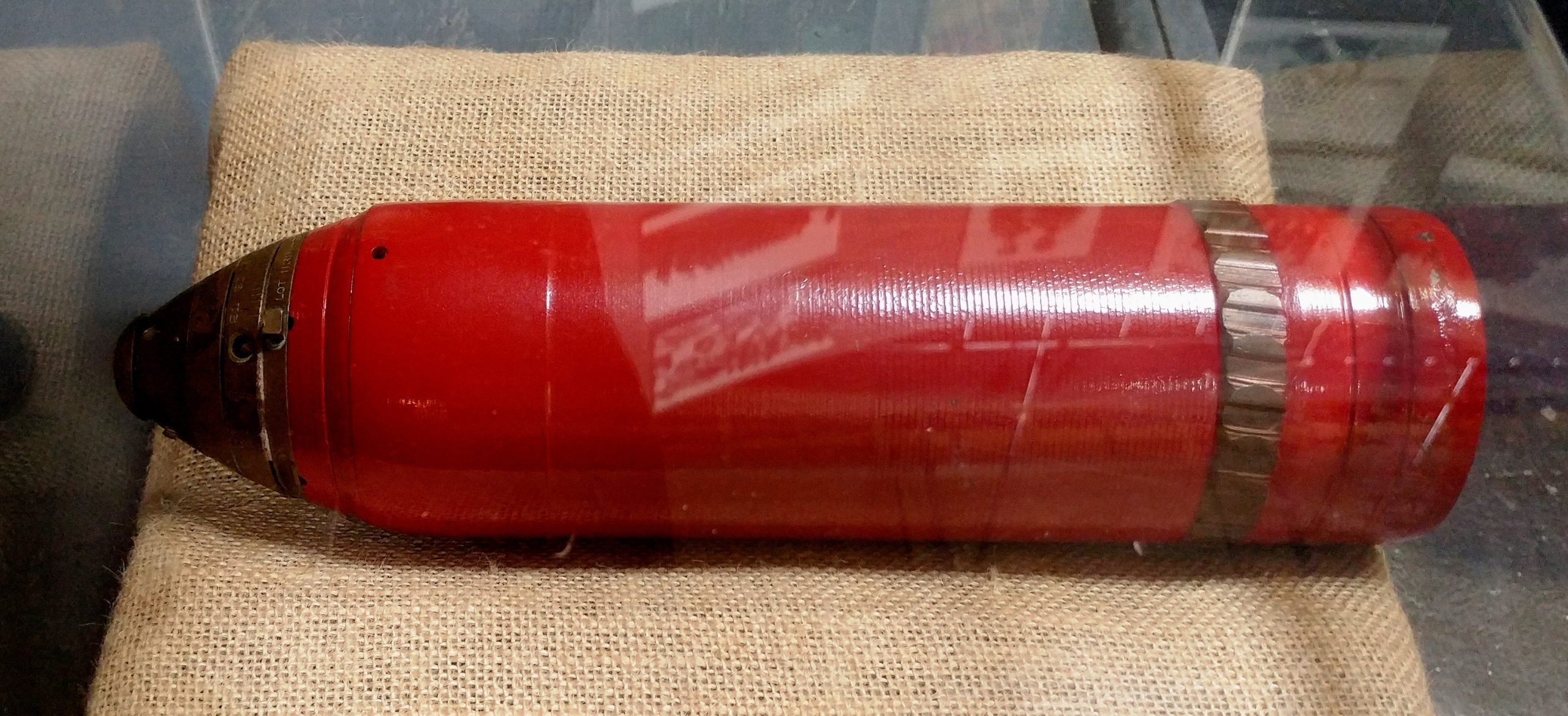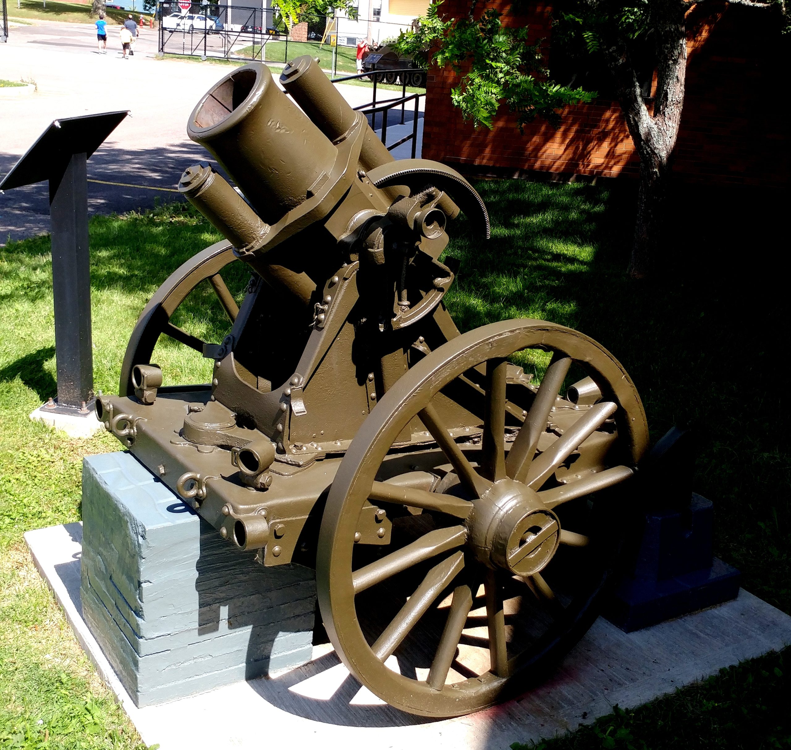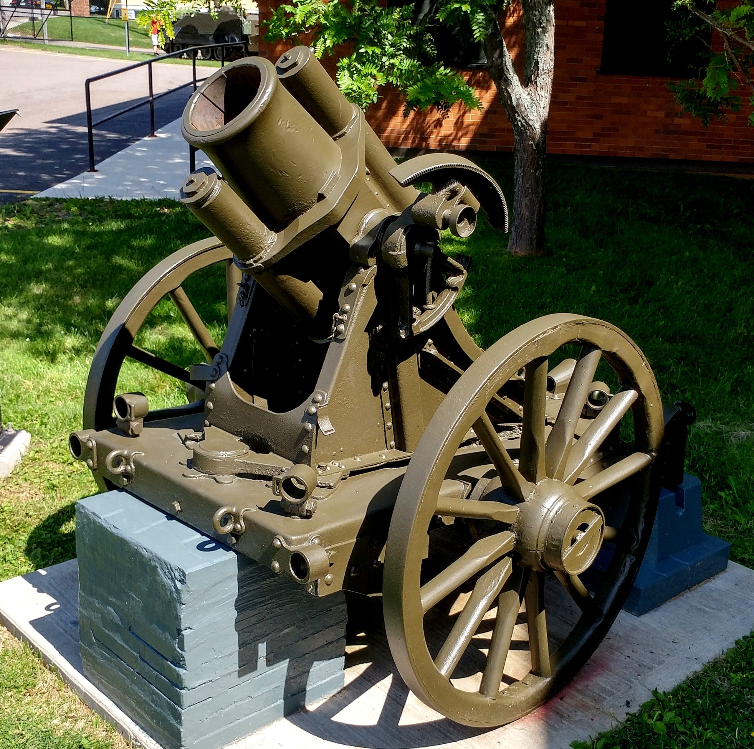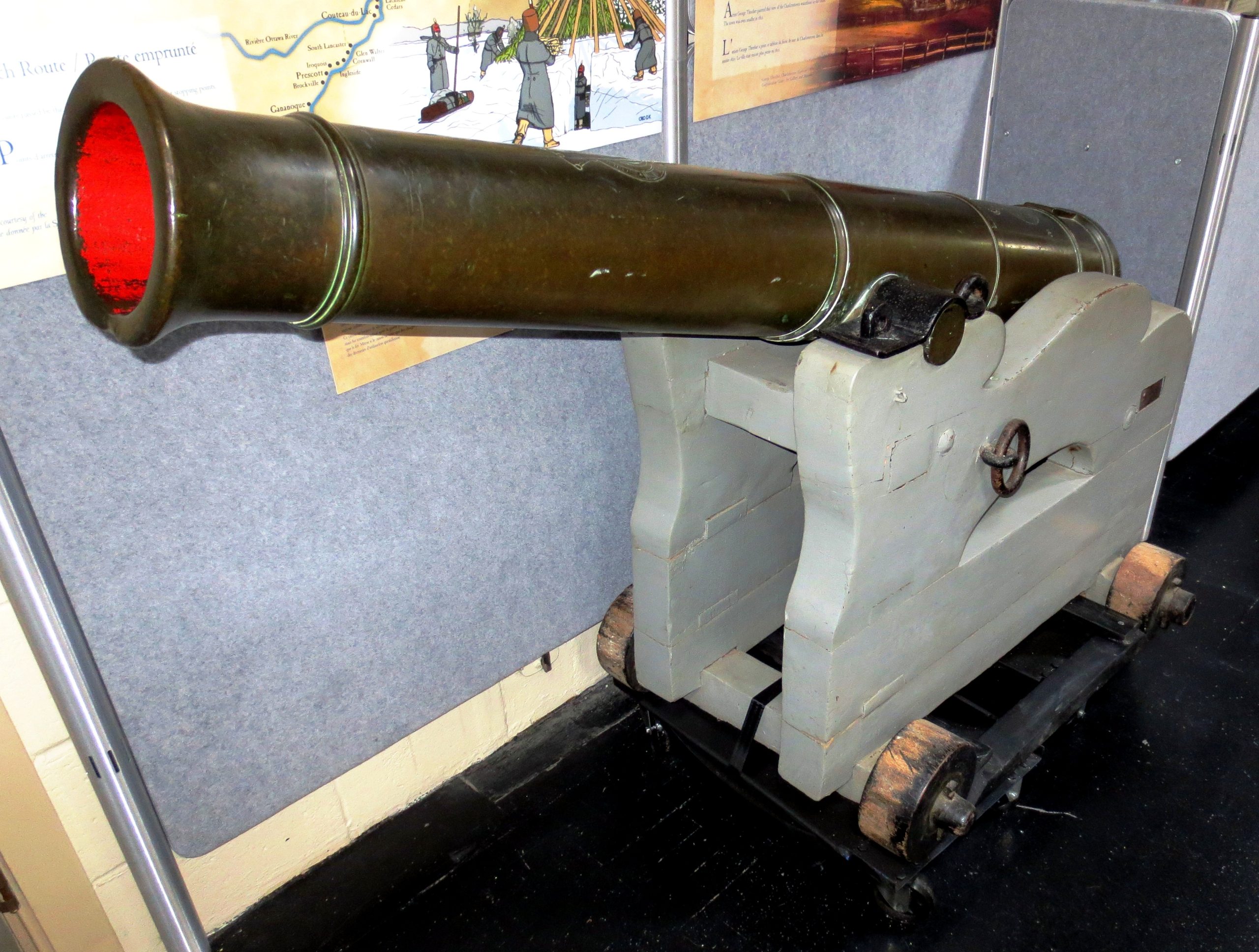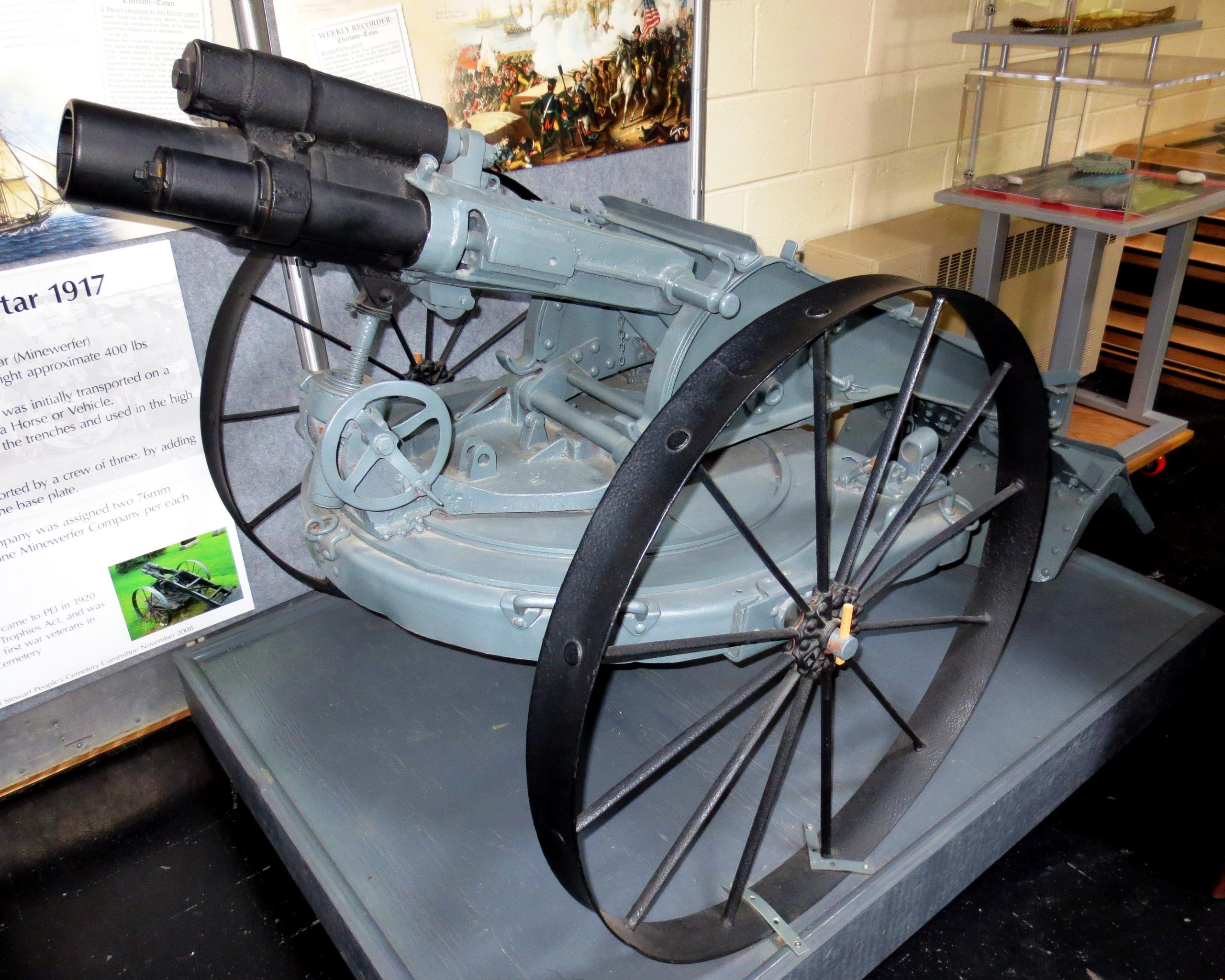 German First World War 7.58-cm leichtes Minenwerfer neuer Art, (7.58-cm leMW), (Serial Nr. 16634), 2047, 1733, 799, 111, and 1686, mounted on iron wheels inside the Armoury. This trench mortar was likely captured ca 1918 by a Battalion of a Brigade with a Canadian Division in the Canadian Expeditionary Force (CEF) in France. It came to PEI in 1920 as part of the War Trophies Act. It stood in the Mount Stewart Cemetery until it was donated to the museum in 2008, and now stands inside the armoury.