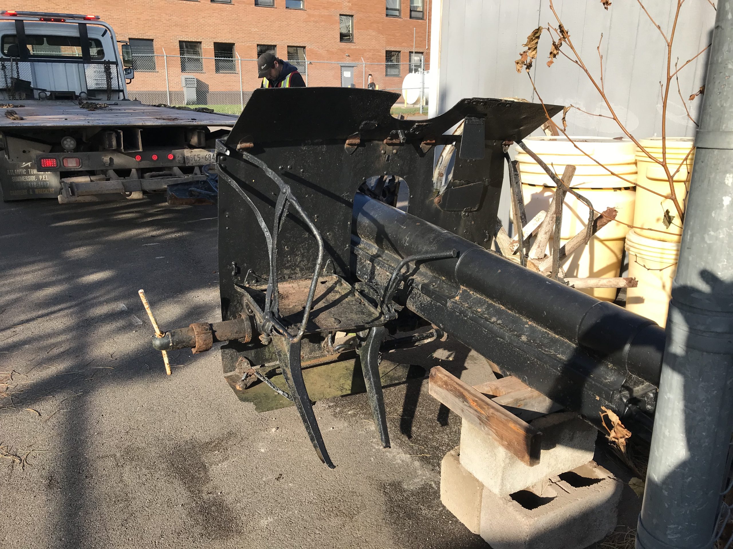 German First World War 7.7-cm FK96 neuer Art (7.7-cm FK96 n.A.) Field Gun, 1915. This gun is listed in the official records, but there is no data on where or when it was captured, most likely in France c1918. The gun initially went to the Town of O’Leary, but during the Second war it was sold to a scrap dealer in Hunter River. The dealer did not scrap it but kept it in his yard for many years. It went on display at a gas station across the road for about 10 years, until the station closed and it was sold at a auction. It was purchased by Bart Bourne in Kensington,now in a home in Alberton. His wife donated the gun to the PEIR Museum, where it will be restored and mounted on proper wooden wheels.