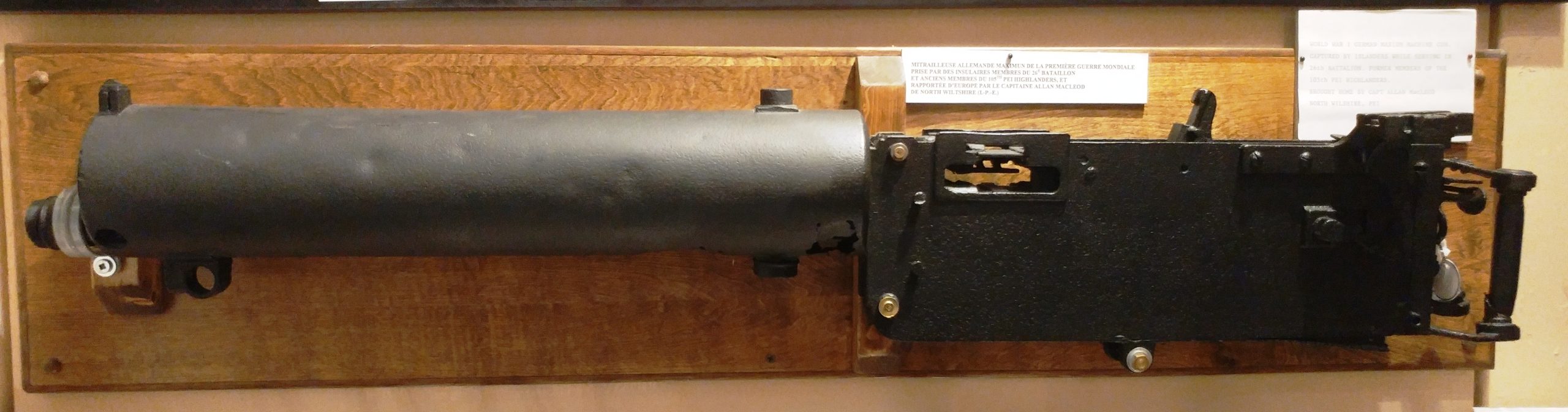 The museum has two German First World War 7.92-mm Maxim Spandau MG 08 Machineguns, on missing its top cover and one in fair shape (Serial Nr. TBC). At least 14 machineguns were allocated to Charlottetown after the war, including (Serial Nrs. 2583, 3187, 3335, 4462, 5053, 5397, 5902, 7119a, 8033, 9282, 9335, 9690, 10154, and 37102). These are likely two of them.
