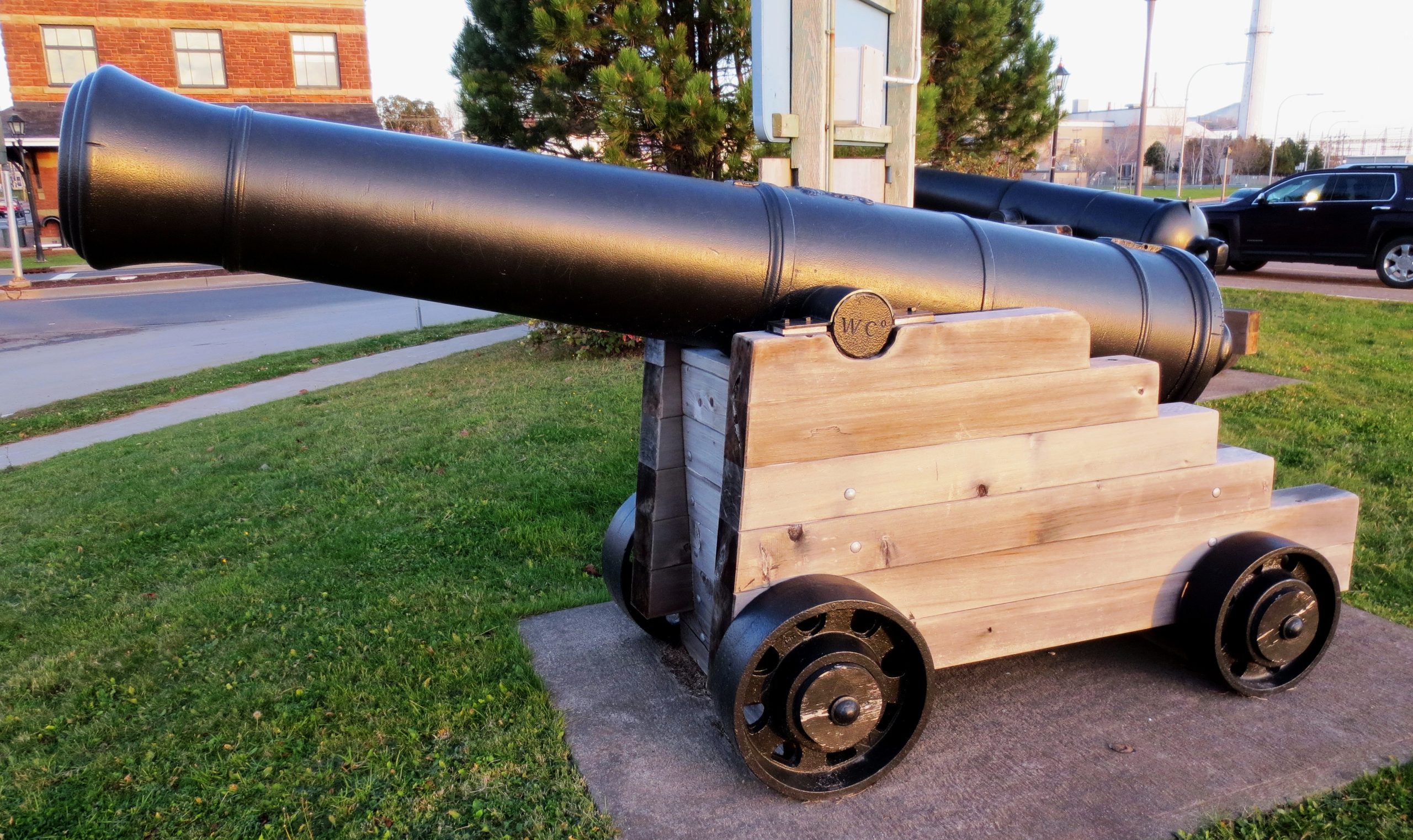 Blomefield Cast Iron 24-pounder 50-cwt Smoothbore Muzzleloading Gun, weight 47-3-4 (5,352 lbs) under the cascabel, Samuel Walker & Company of Rotherham, England (WCo) on left trunnion, (Serial No. 6) on right trunnion, King George III cypher, broad arrow mark, mounted on a wood naval gun carriage, 210 Water Street. No. 2 of 2 guns facing away from the water.