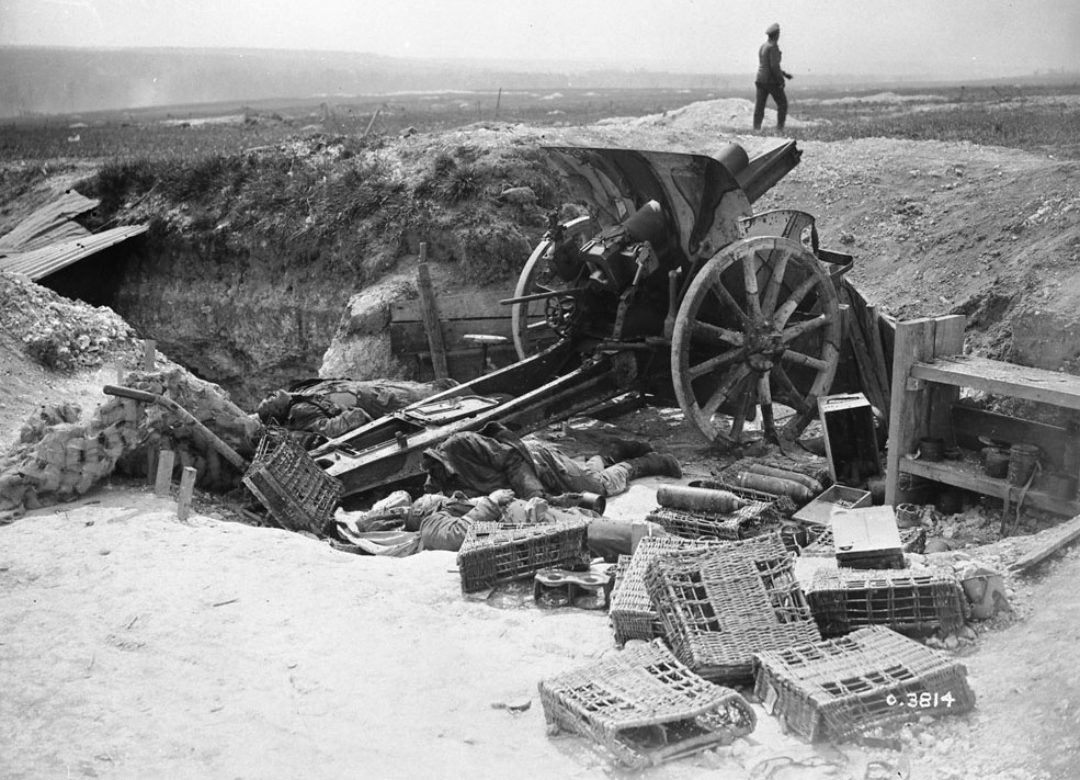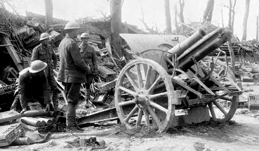 German First World War 10.5-cm Feldhaubitze 98/09 captured by Canadians, at Vis en Artois, France, Sep 1918.