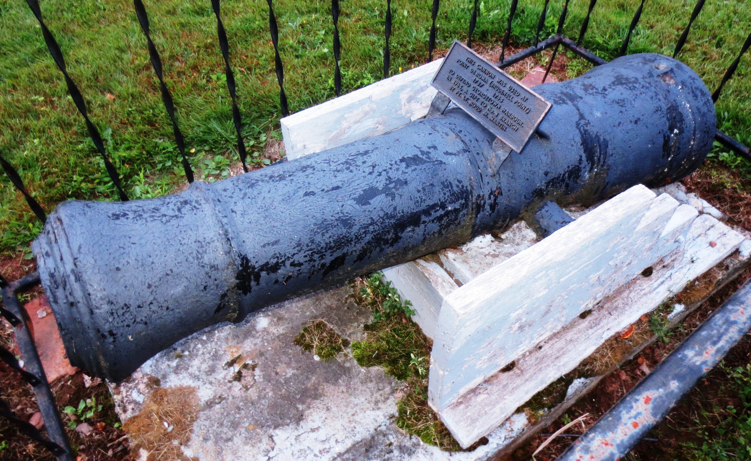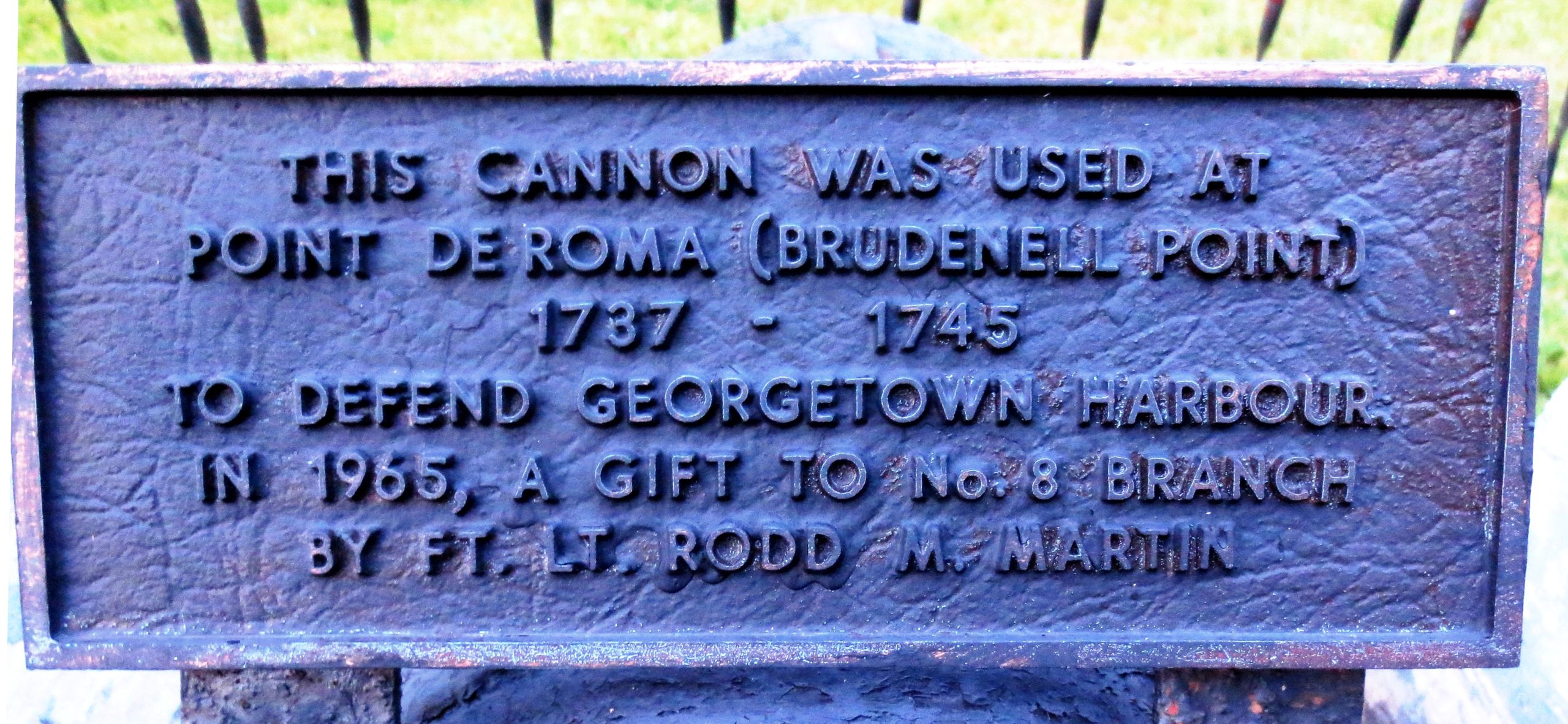 Cast Iron possible 9-pounder Smoothbore Muzzleloading Gun, 4-inch bore, heavily corroded, no visible markings. A plaque stating “This cannon was used at Point De Roma (Brudinell Point), 1737-1745, to defend Georgetown Harbour. In 1965, a gift to No. 8 Branch by Ft. Lt. Rodd M. Martin”. The gun stands beside the cenotaph in front of the Royal Canadian Legion at 15 Douses Road.