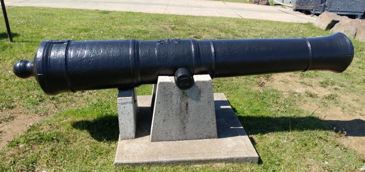Cast Iron 18-pounder 42-cwt Smoothbore Muzzleloading Gun, weight 41-3-1 (4,677 lbs), (SOLID 116) on left trunnion, (Z) on right trunnion, King George III cypher, 1779-1783, broad arrow mark, mounted on a concrete carriage, No. 6 of 6 guns in Loyalist Park on Water Street.