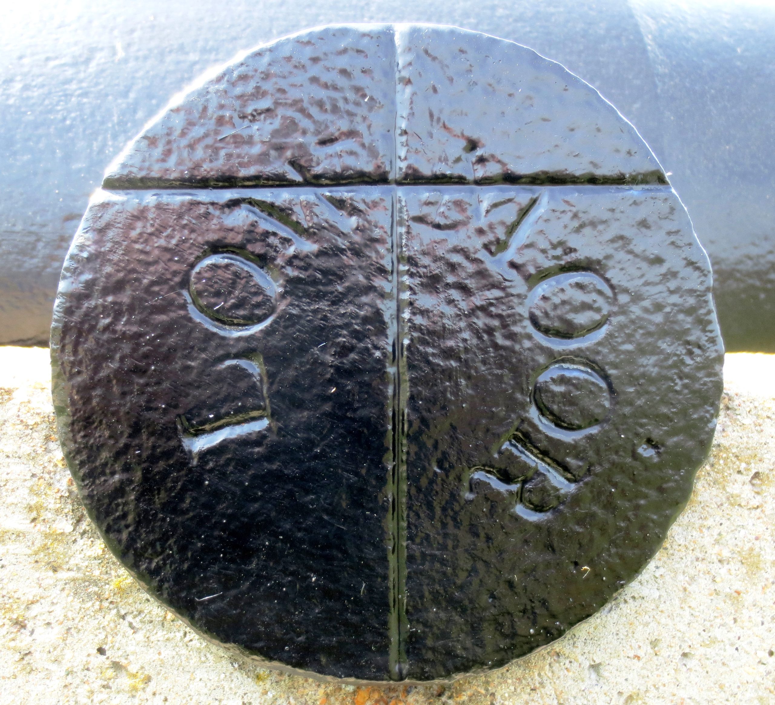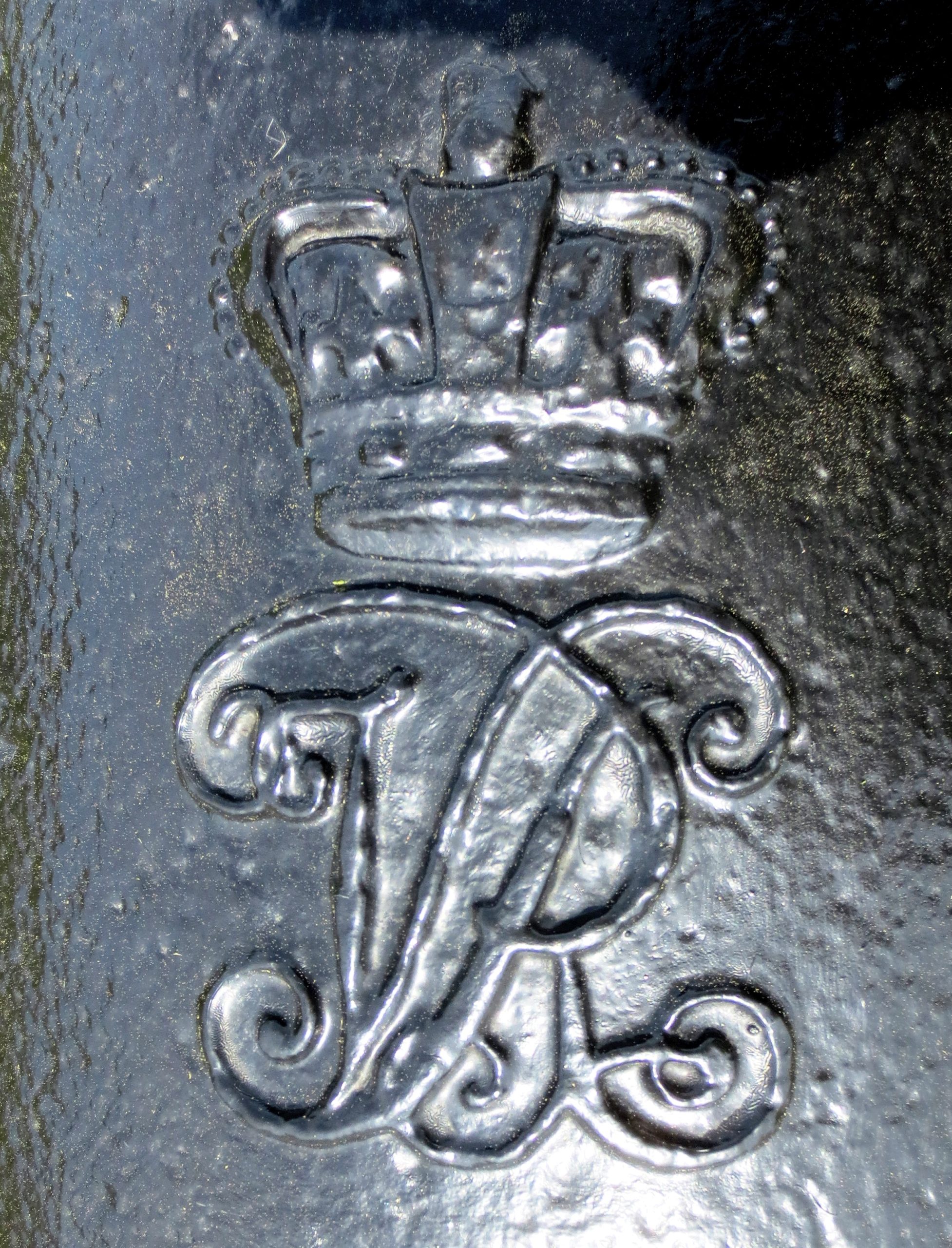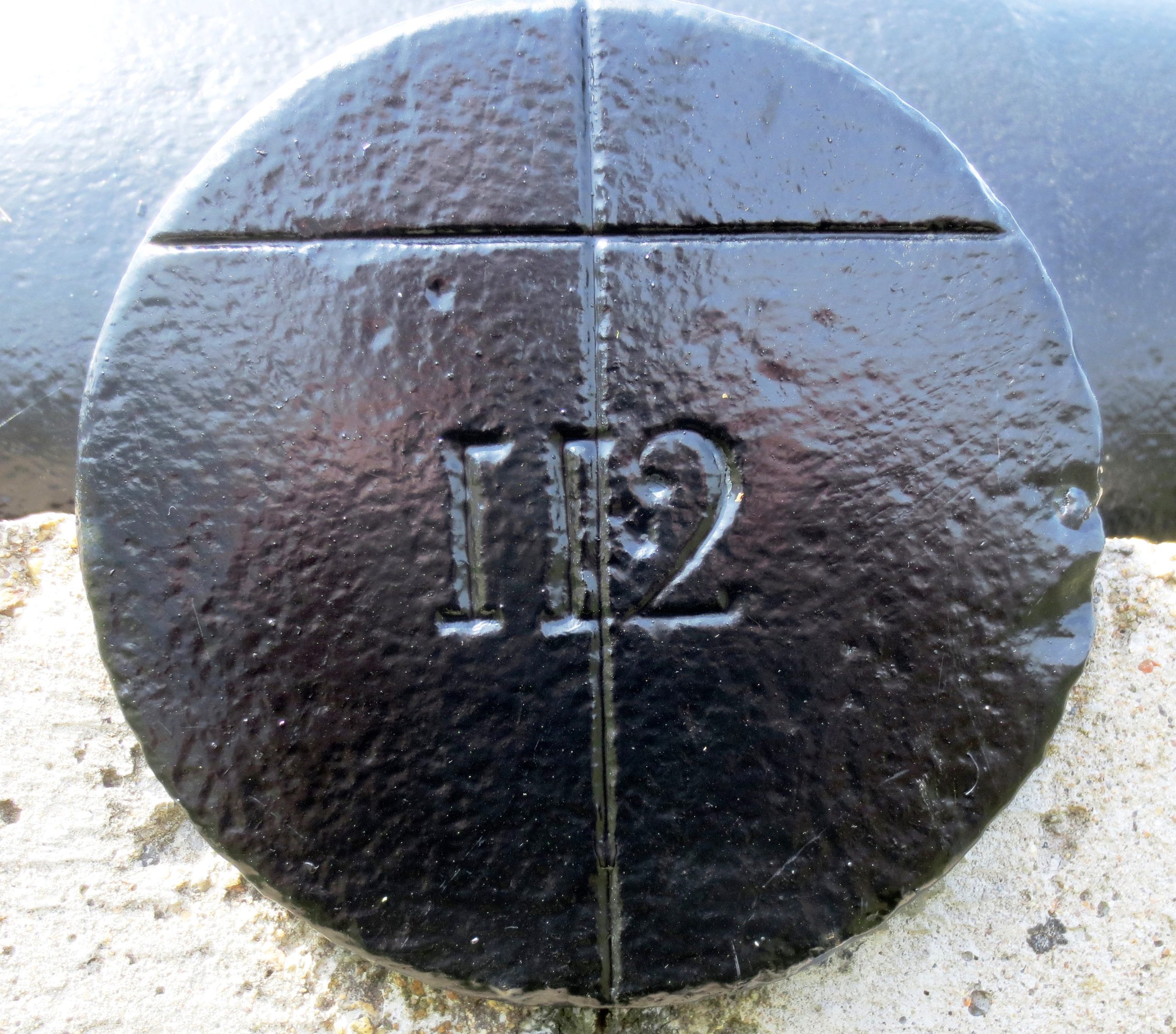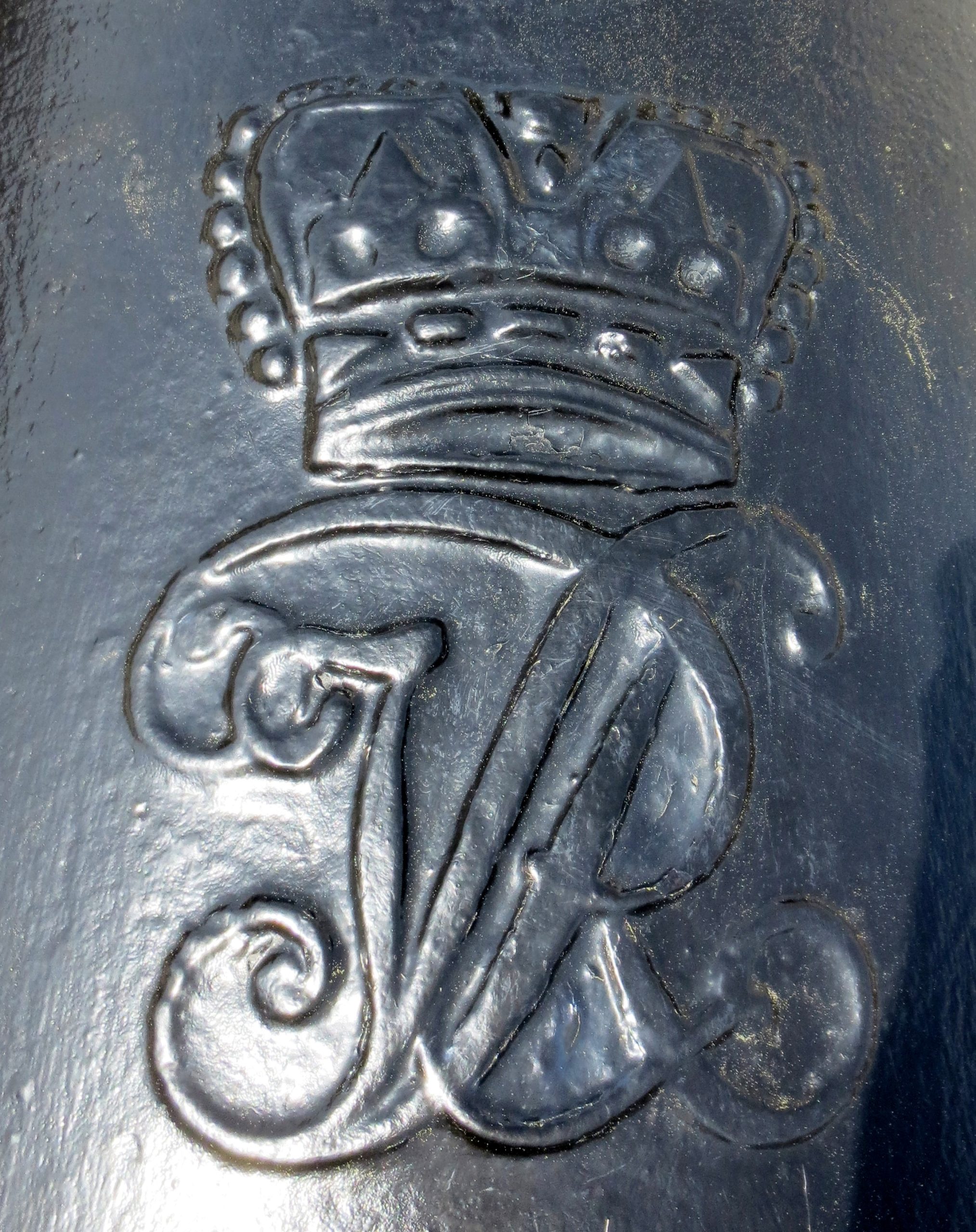 1844, (WCo) on left trunnion, (Serial No. 1112) on right trunnion, Queen Victoria cypher, broad arrow mark, mounted on a concrete carriage, No. 3 of 6 guns in Loyalist Park.