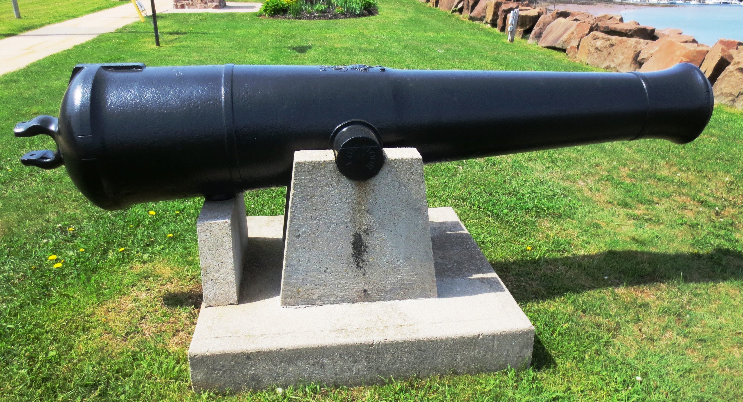 Cast Iron 18-pounder 42-cwt Smoothbore Muzzleloading Gun with Millar pattern breeching ring, weight 42-3-0 (4,788 lbs), 1841, (WCo) on left trunnion, (Serial No. 664) on right trunnion, CVH of breeching ring, Queen Victoria cypher, broad arrow mark, mounted on concrete carriage, No. 4 of 6 guns in Loyalist Park.