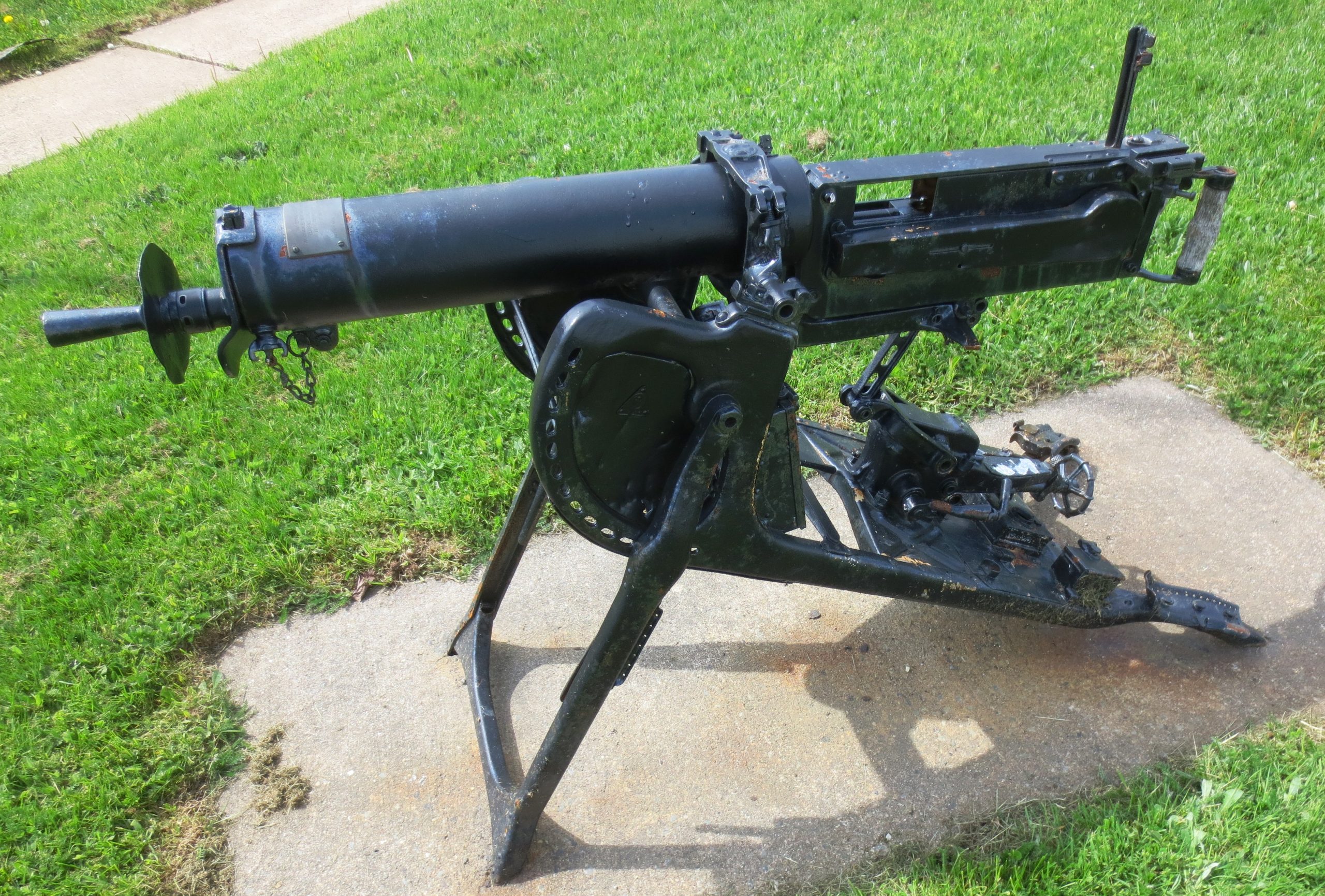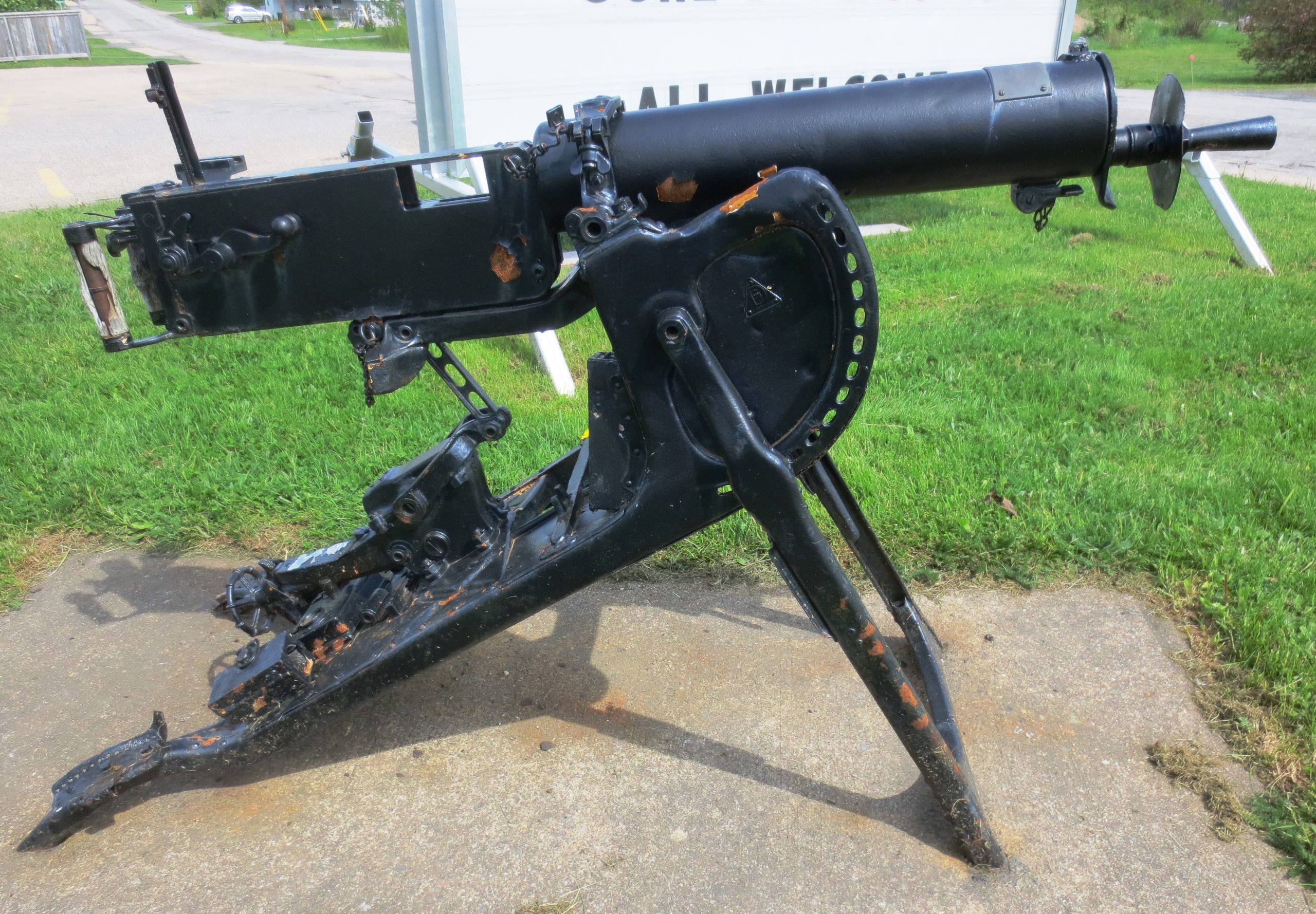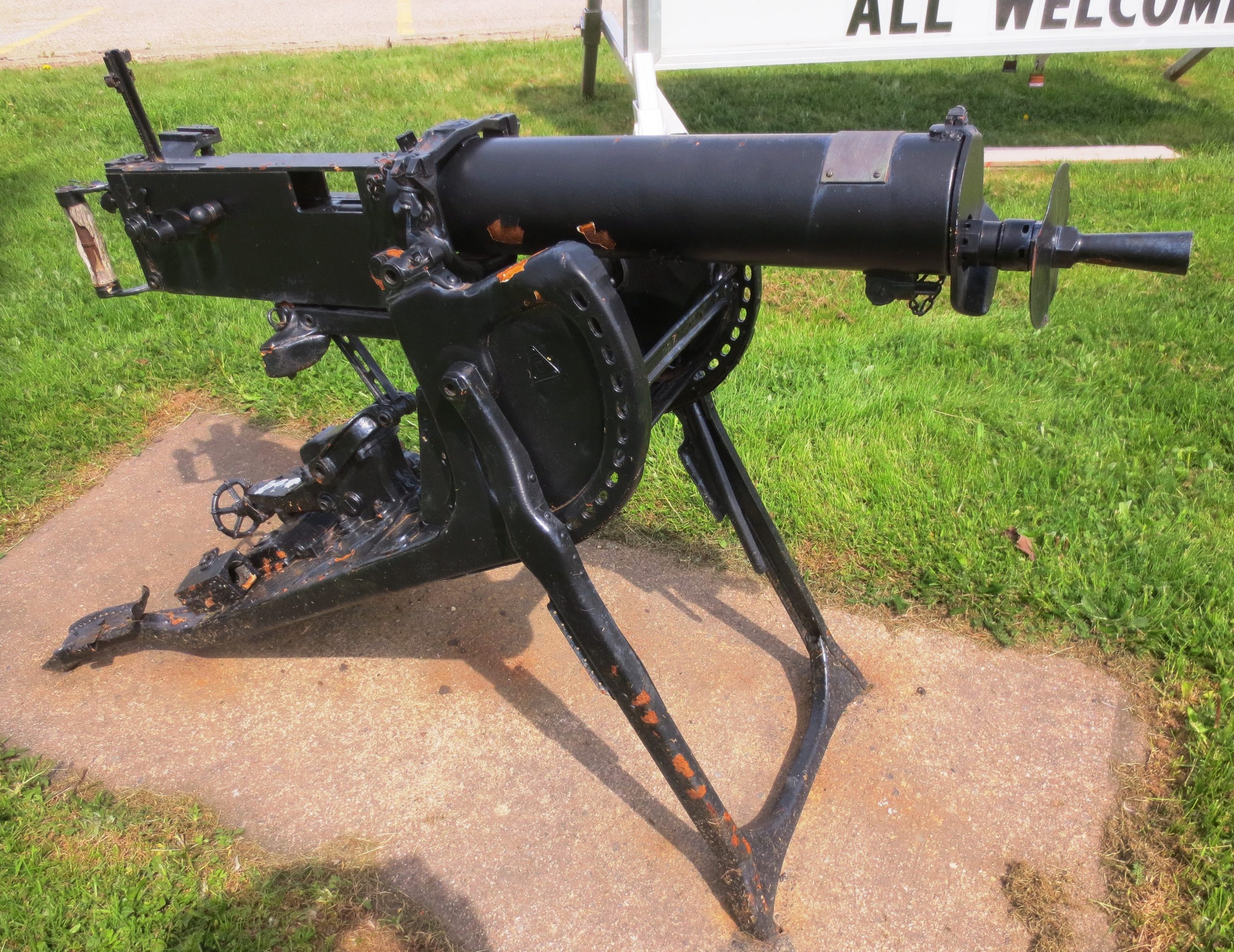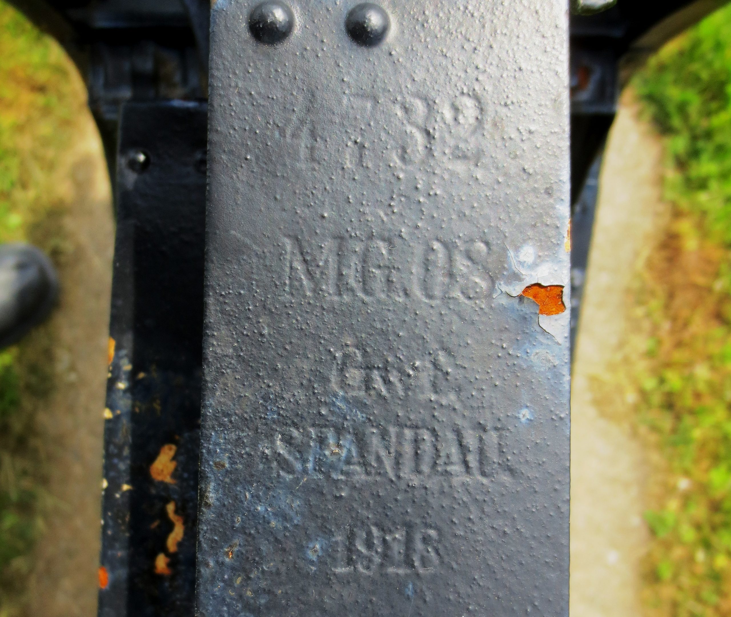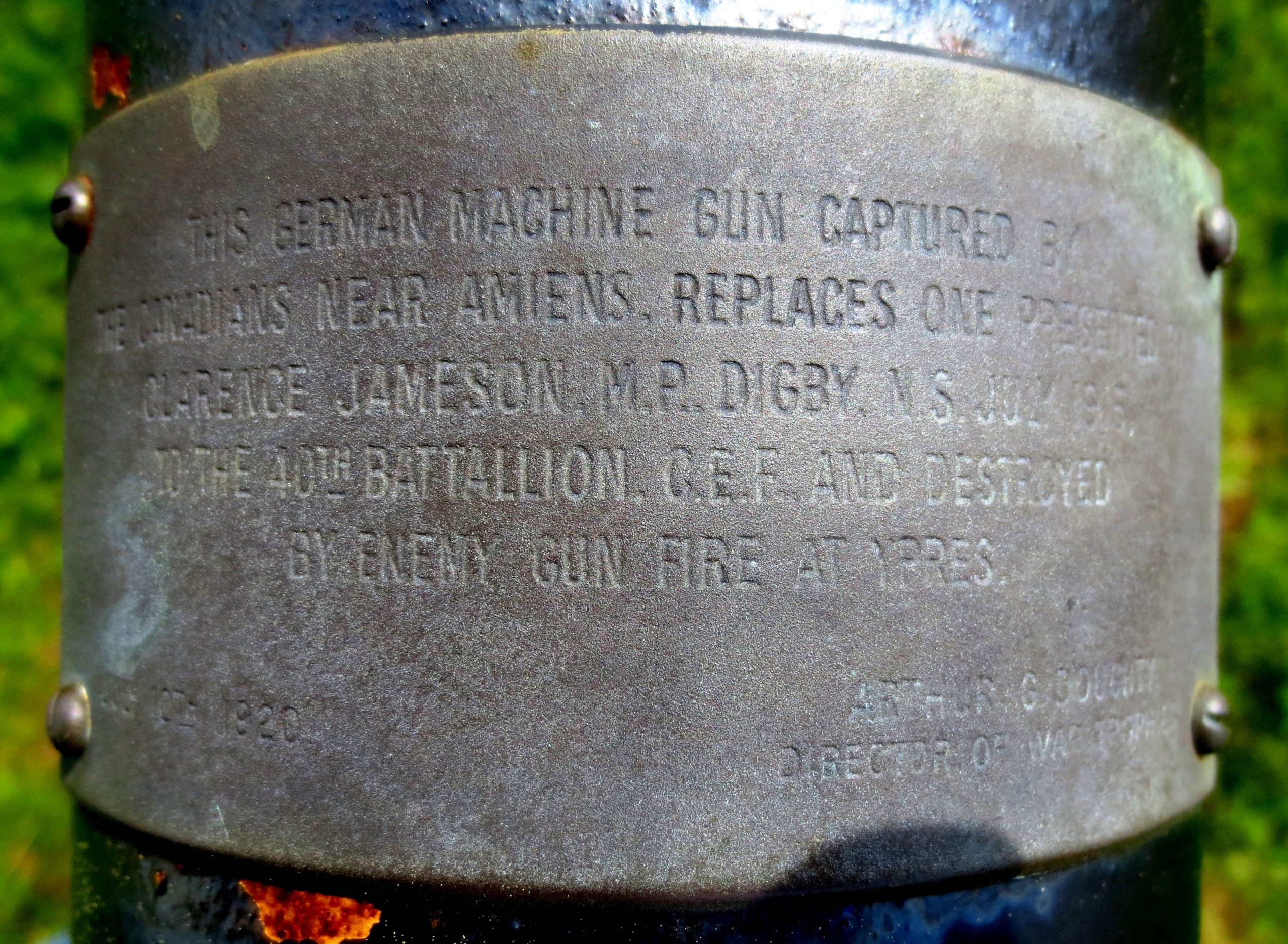 German First World War 7.92-mm Maxim Spandau MG 08 Machinegun (Serial Nr. 4732), 1918, mounted on a schlitten stand. This weapon was likely captured ca 1918 by a Battalion of an Infantry Brigade in a Canadian Division with the Canadian Expeditionary Force (CEF), in France. This MG 08 is displayed at the cenotaph. Royal Canadian Legion Branch No. 19, 92 Mount Street.