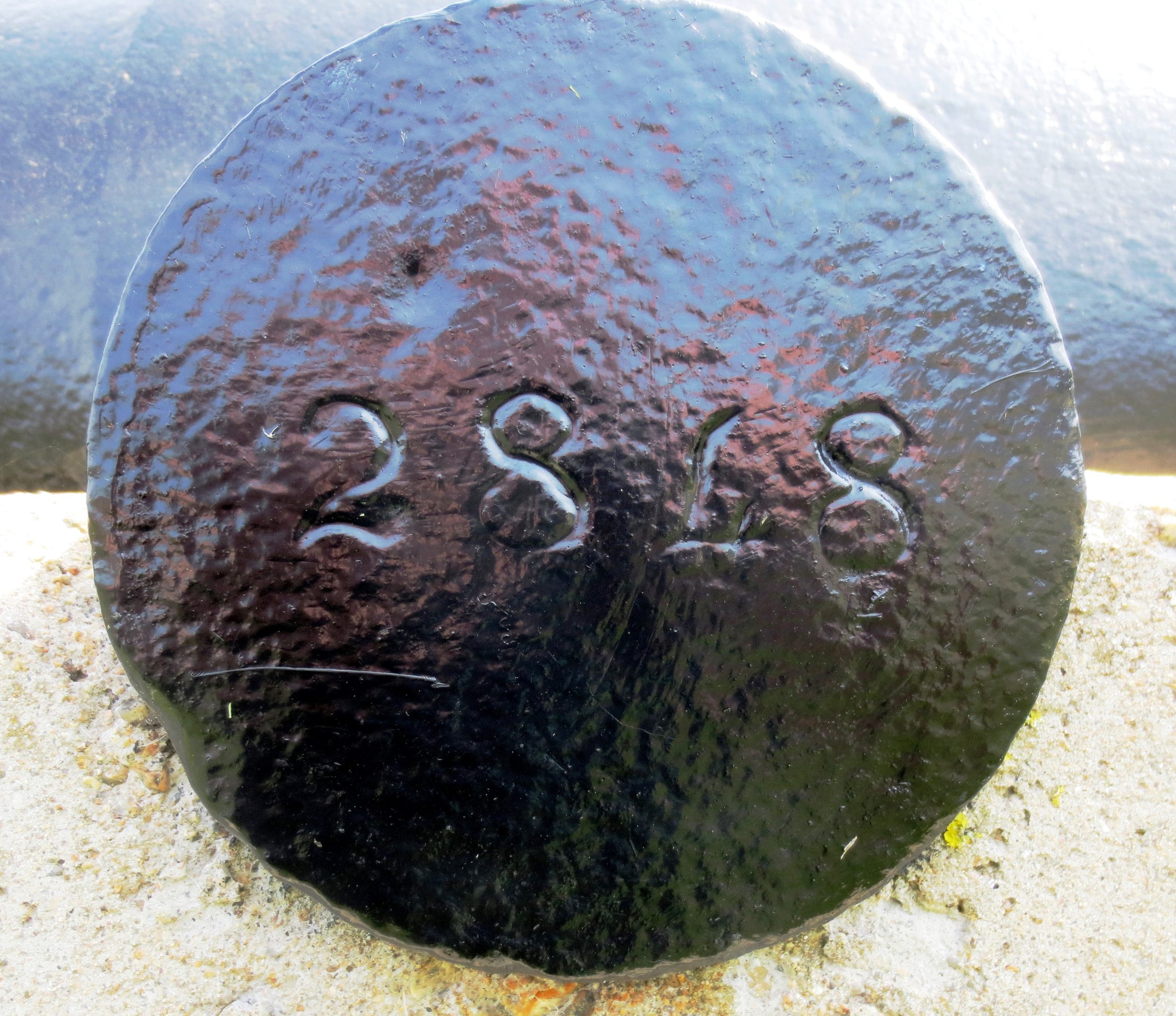 Cast Iron 18-pounder 42-cwt Smoothbore Muzzleloading Gun with Millar pattern breeching ring, weight 43-2-14 (4,886 lbs), 1844, (Serial No. 2848) on left trunnion, Low Moor Ironworks of Bradford, England (Low Moor) on right trunnion, Queen Victoria cypher, broad arrow mark, mounted on a concrete carriage, No. 2 of 6 guns in Loyalist Park.