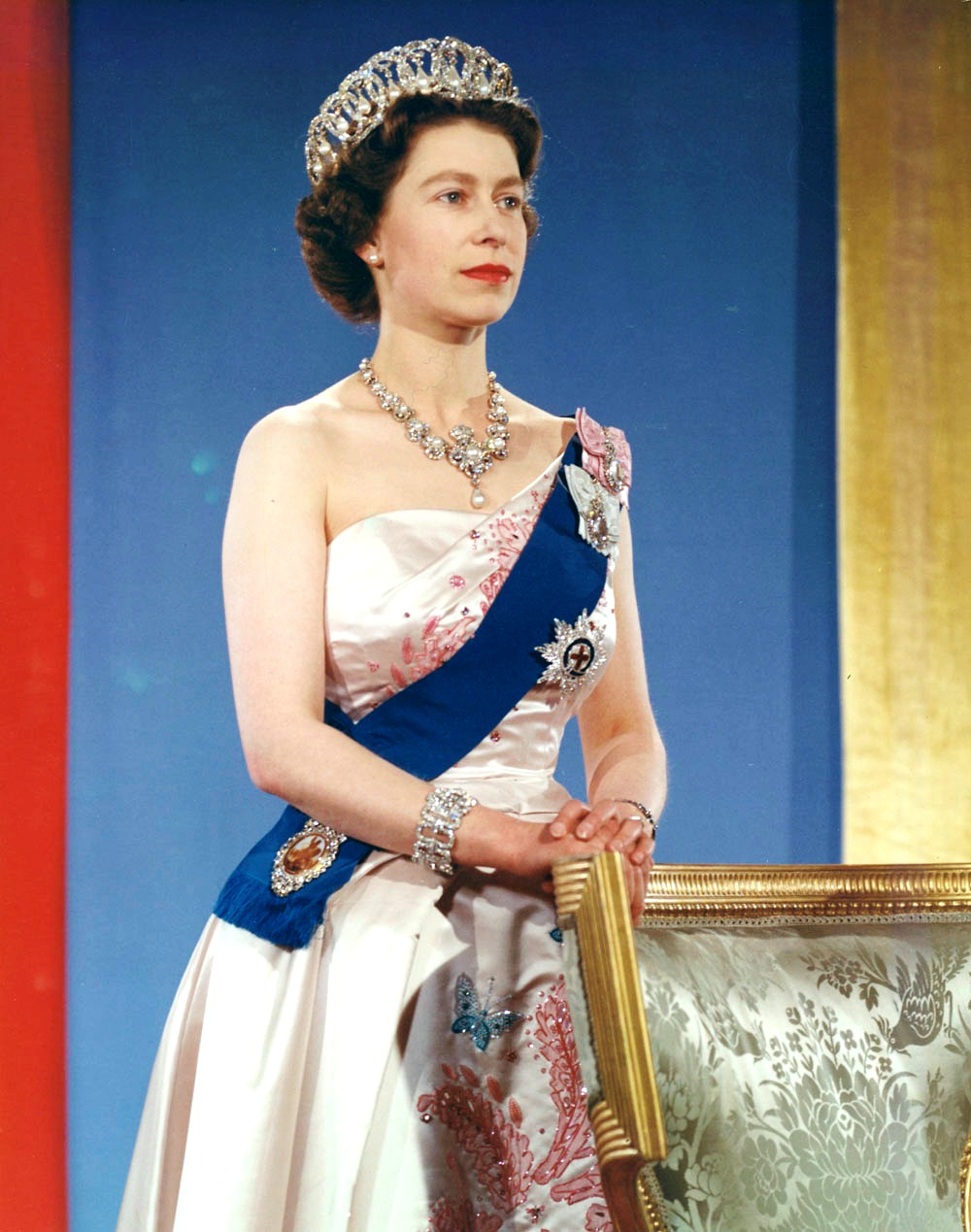 Queen Elizabeth II wearing the Vladimir Tiara, the Queen Victoria Jubilee Necklace, the blue Garter Riband, Badge and Garter Star and the Royal Family Orders of King George V and King George VI, photo taken in 1959. She has reigned from 6 Feb 1952 to the present day. (Library and Archives Canada Photo, MIKAN No. 4314245)
