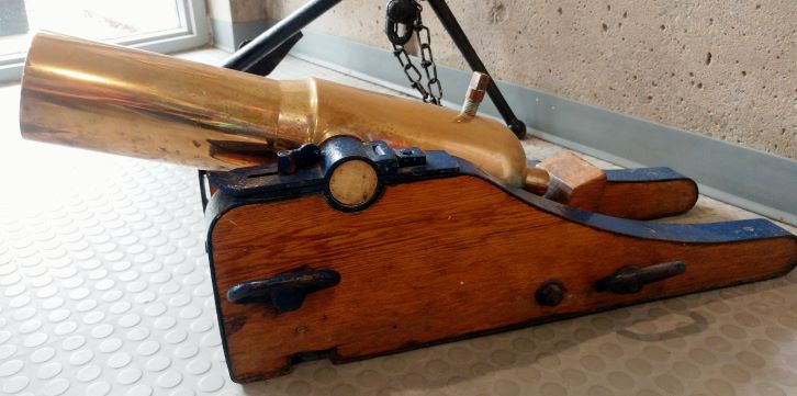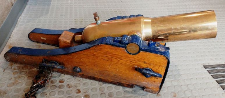 This Lyle type gun was used to fire life lines from ship or shore. Light-weight rope was shot out to a wreck after it had been carefully wound on a rope-board so it would uncoil without snagging. The crews would then use this rope to haul out the heavier lines which actually carried the breeches buoy. The survivors would brought ashore or to the tugboat in a breeches buoy, which was a pair of canvas pants sewed onto a life-preserver. These line guns are used primarily for shore based rescue operations. The shooter would fire, aiming over the victims head and then pull the line within reach of the victim. They are also useful for rescuing victims that have fallen through the ice, or are stranded on a cliff or burning building. Boats in distress need larger lines. Lyle guns were designed to throw projectiles weighing approximately 15 pounds, carrying heavier rope over 1000 feet. Getting this equipment close to a wreck would have been difficult, given the likelihood the conditions that caused the wreck would still have been present. It is mounted on a wood naval gun carriage, inside the ship.