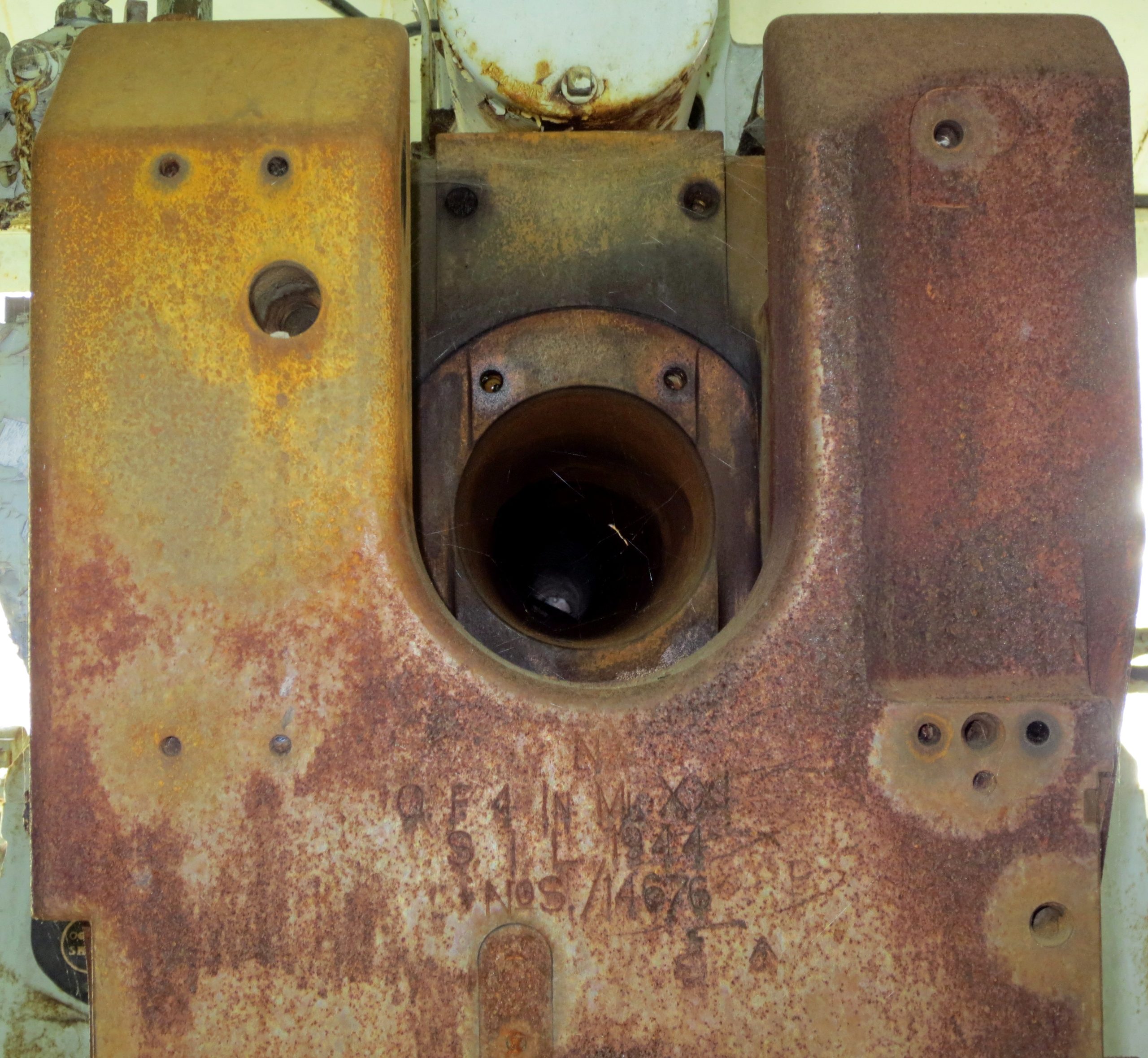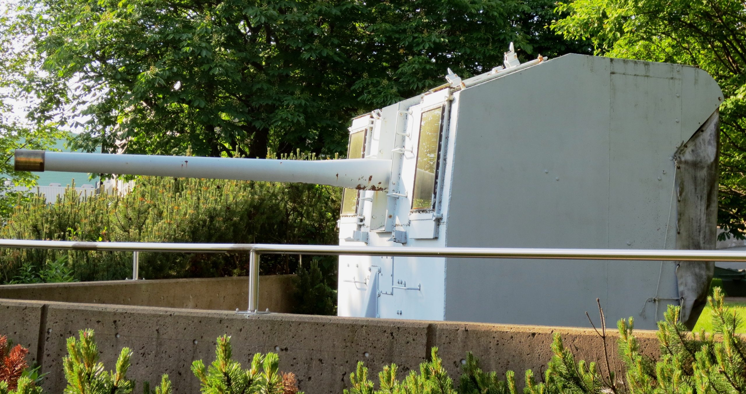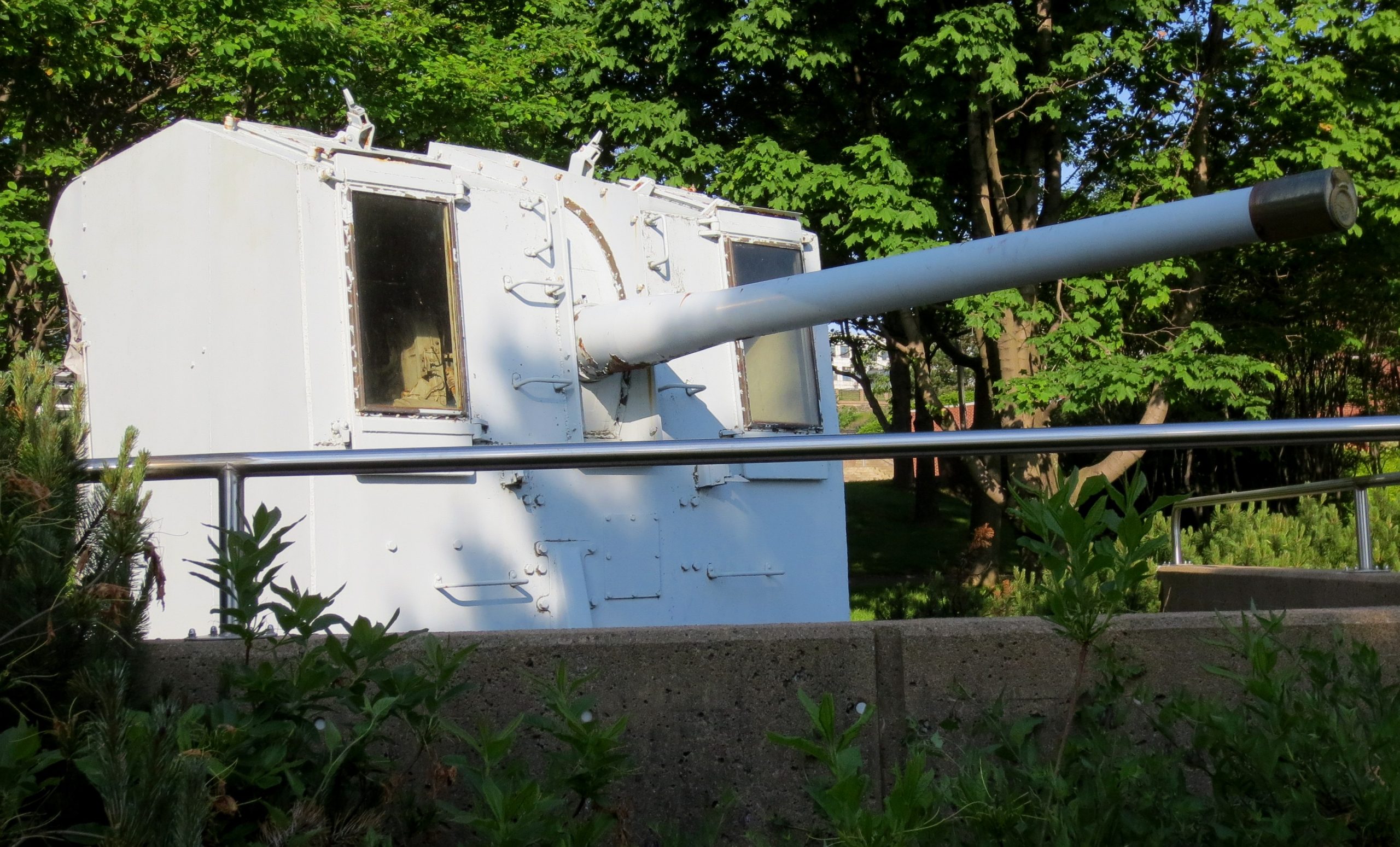 QF 4-inch/40 Mk. XXI Gun on the High Angle Single Mk. XXIV Mounting, SIL 1944, (Serial No. S/14676), King George VI cypher, mounted in a deck gun turret. This naval gun is located beside the MARCOM HQ below the McDonald Bridge in the Halifax Dockyard.