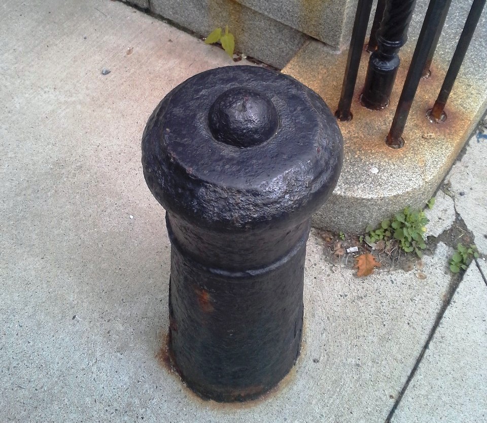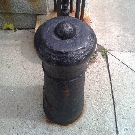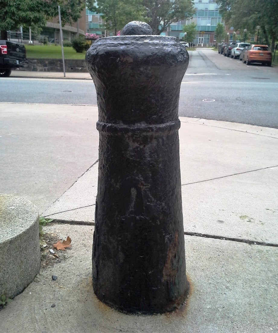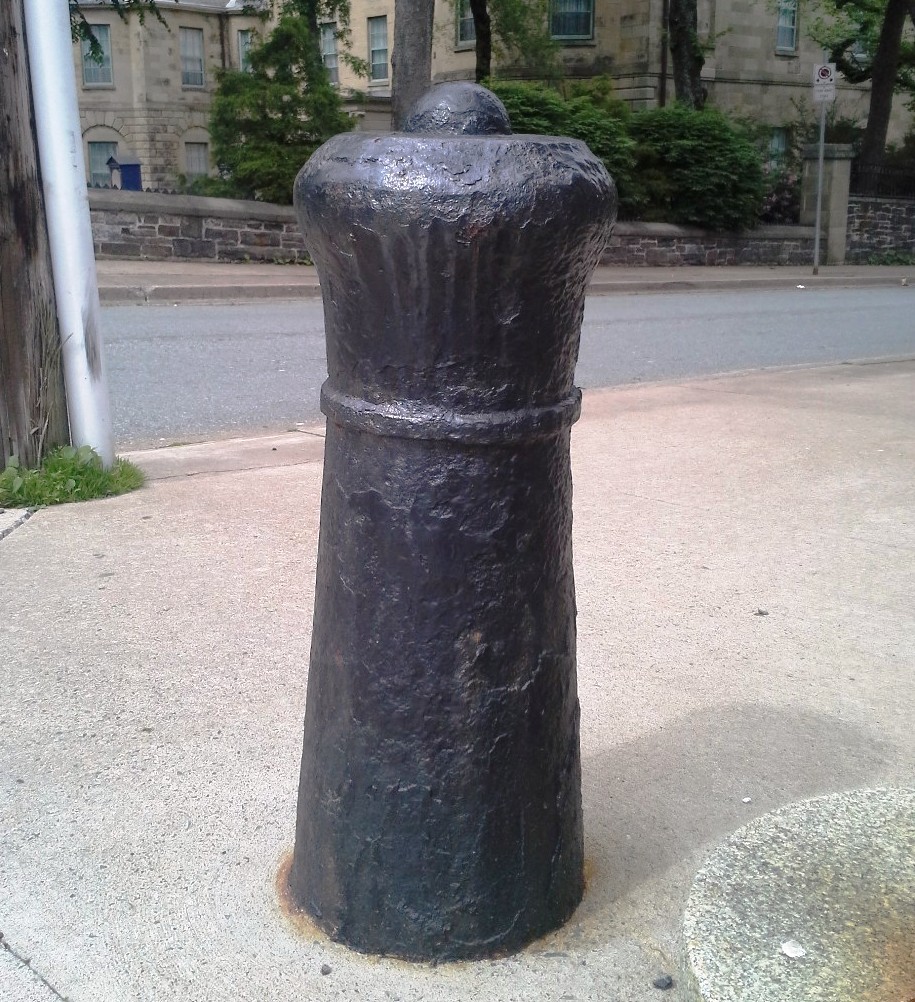 Cast Iron (possibly 12-pounder) Smoothbore Muzzleloading Gun, embedded in the ground with the barrel up, heavily corroded, no markings visible, SE corner of Barrington Street and Bishop Street. There are six known surviving corner cannons in Halifax and Dartmouth, this one by Government House on Barrington Street, one in Historic Properties, one in the Halifax Shipyard, one in the Naval Dockyard, two in Historic Properties, and one in Dartmouth.