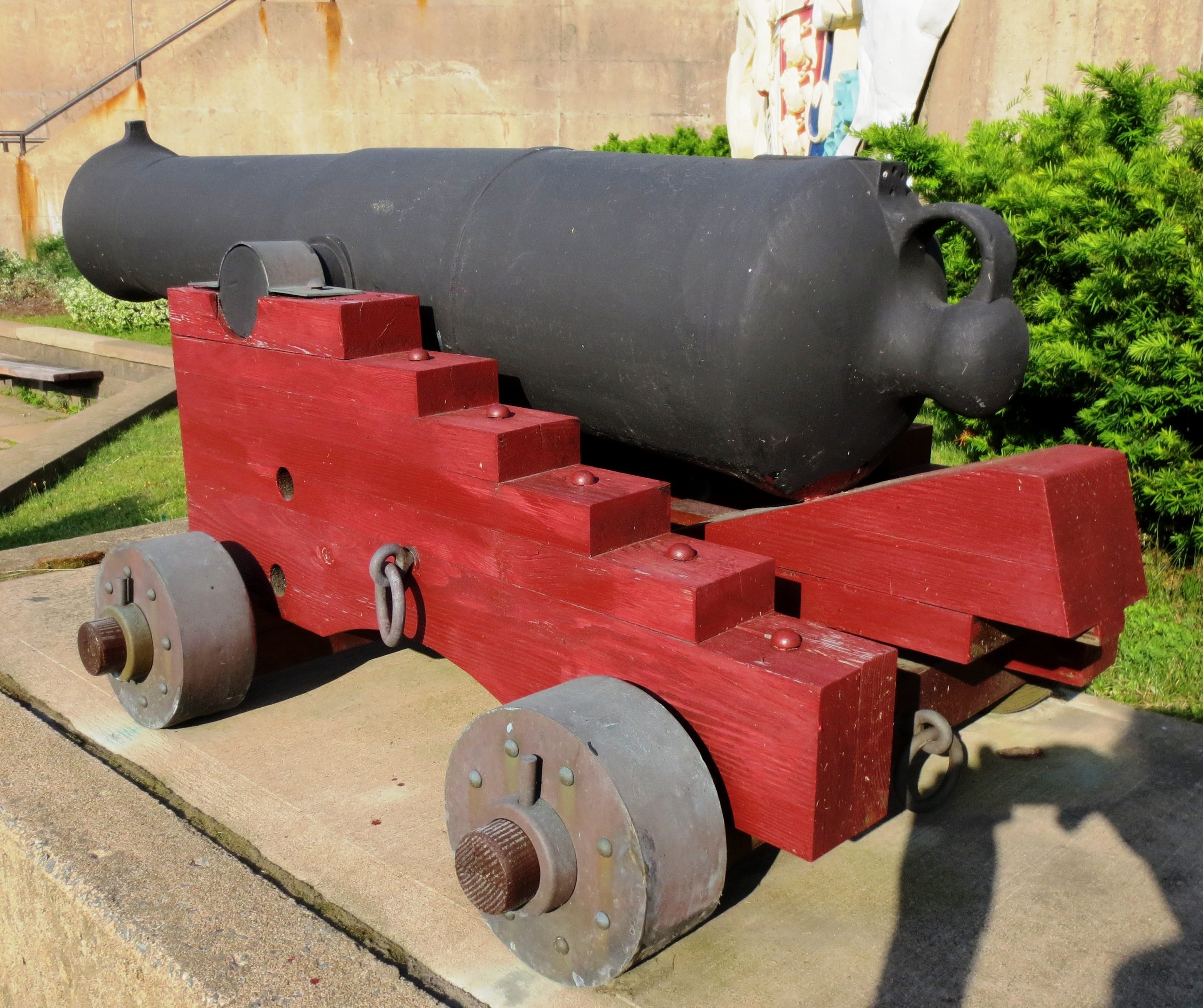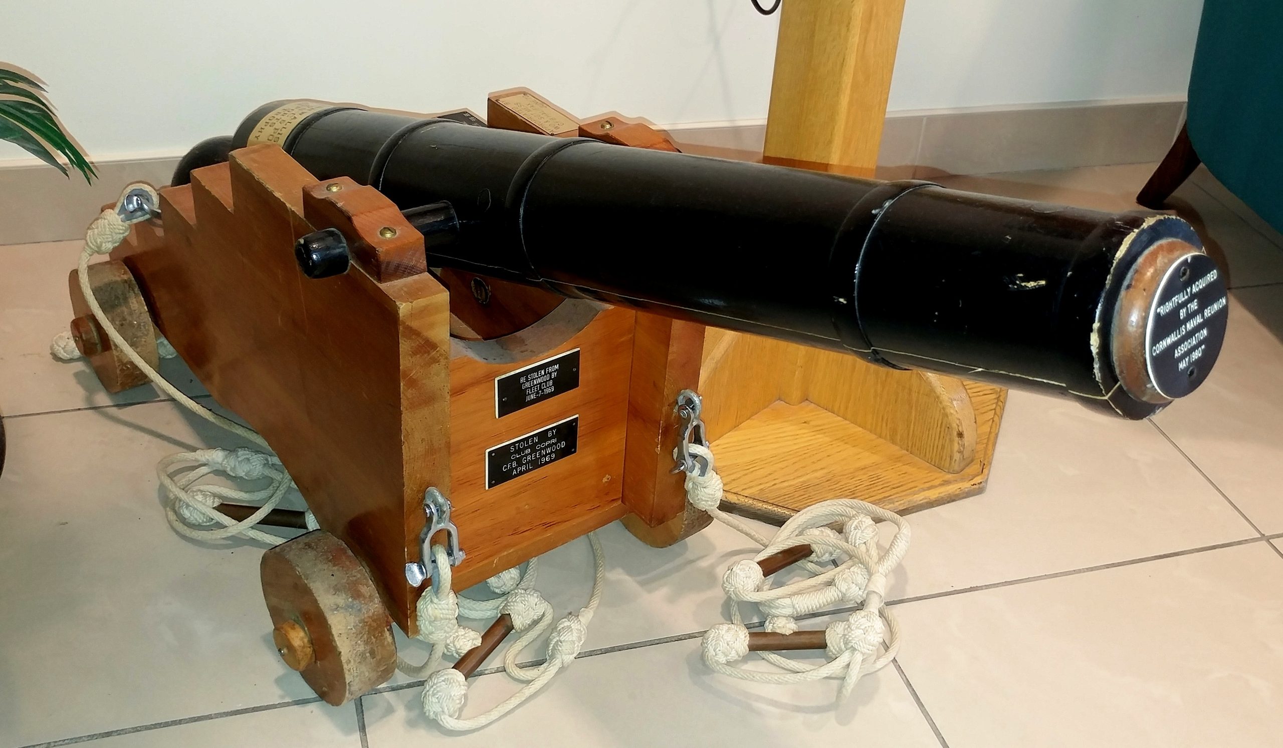 Replica gun, standing inside the building at the entrance to the Mess.