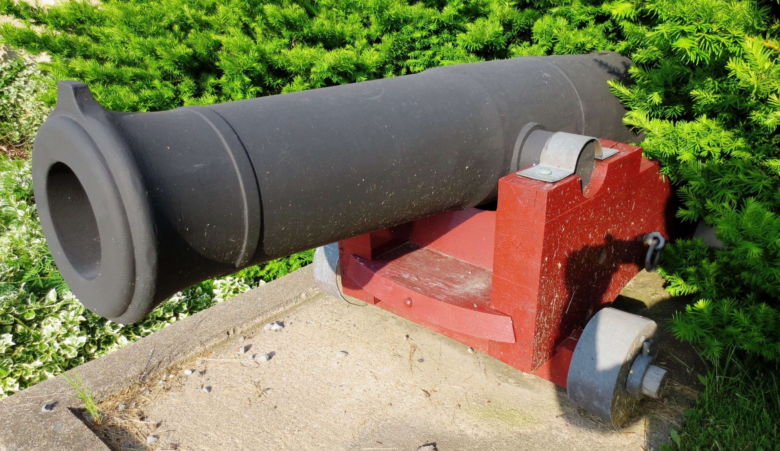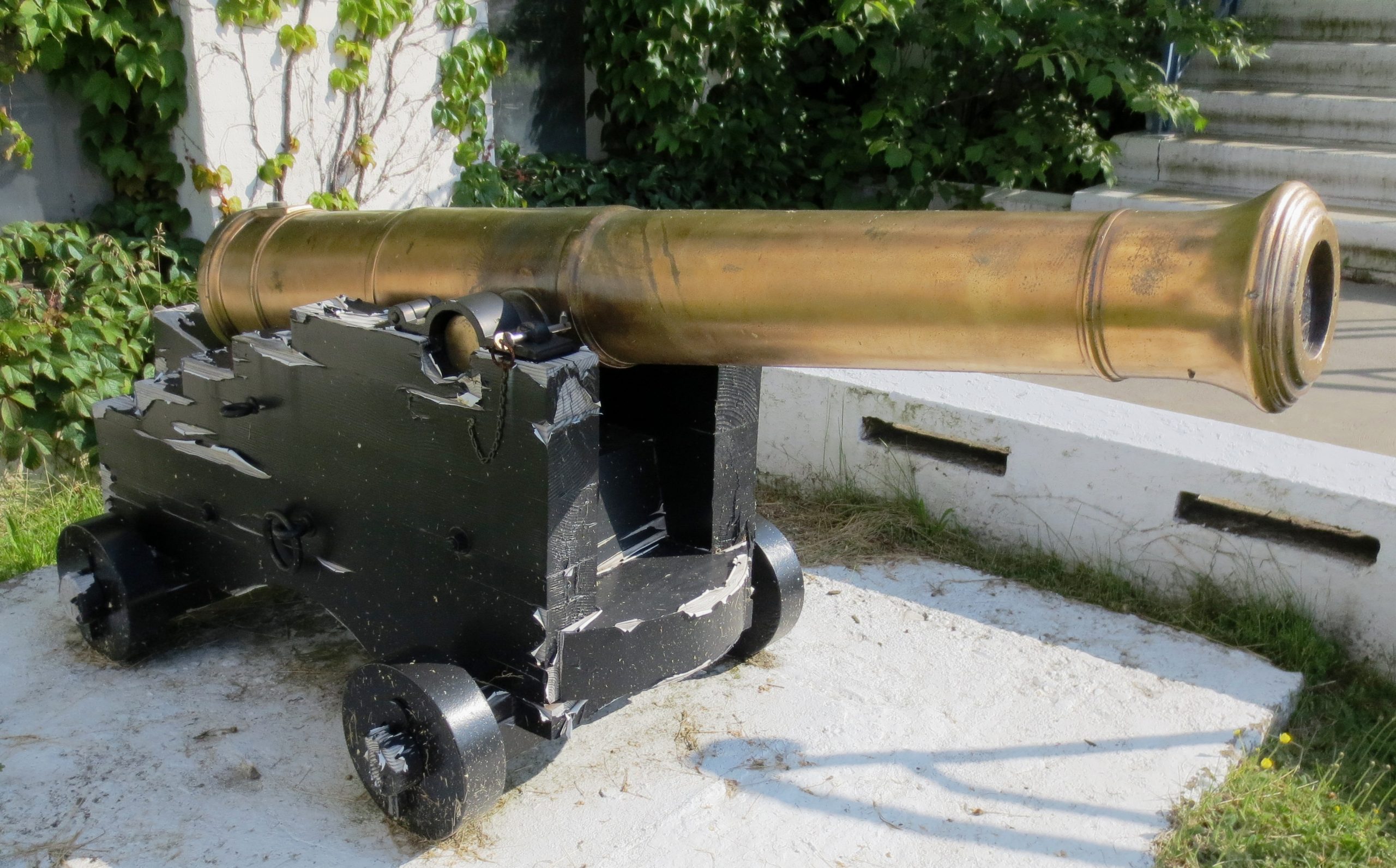 Blomefield Cast Iron Smoothbore Muzzleloading Gun, 3-inch bore, (Serial No. 3905), broad arrow mark, Queen Victoria cypher and the cypher for the Master General of the Ordnance (Fox Maule-Ramsay, 11th Earl of Dalhousie, KT, GCB, PC, 22 April 1801 – 6 July 1874), mounted on a wood naval gun carriage. No. 1 beside the main entrance to HMC Dockyard.