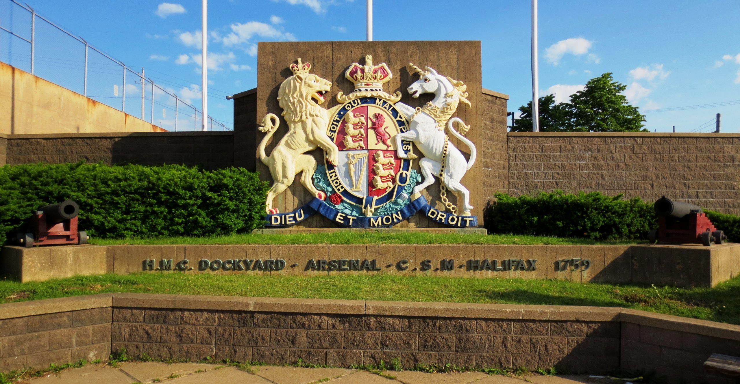 Her Majesty’s Canadian Dockyard – L’arsenal – canadien de Sa Majesté CSM Halifax, 1759, Coat of Arms flanked by a pair of cast iron smoothbore muzzle-loading guns mounted on naval carriages.