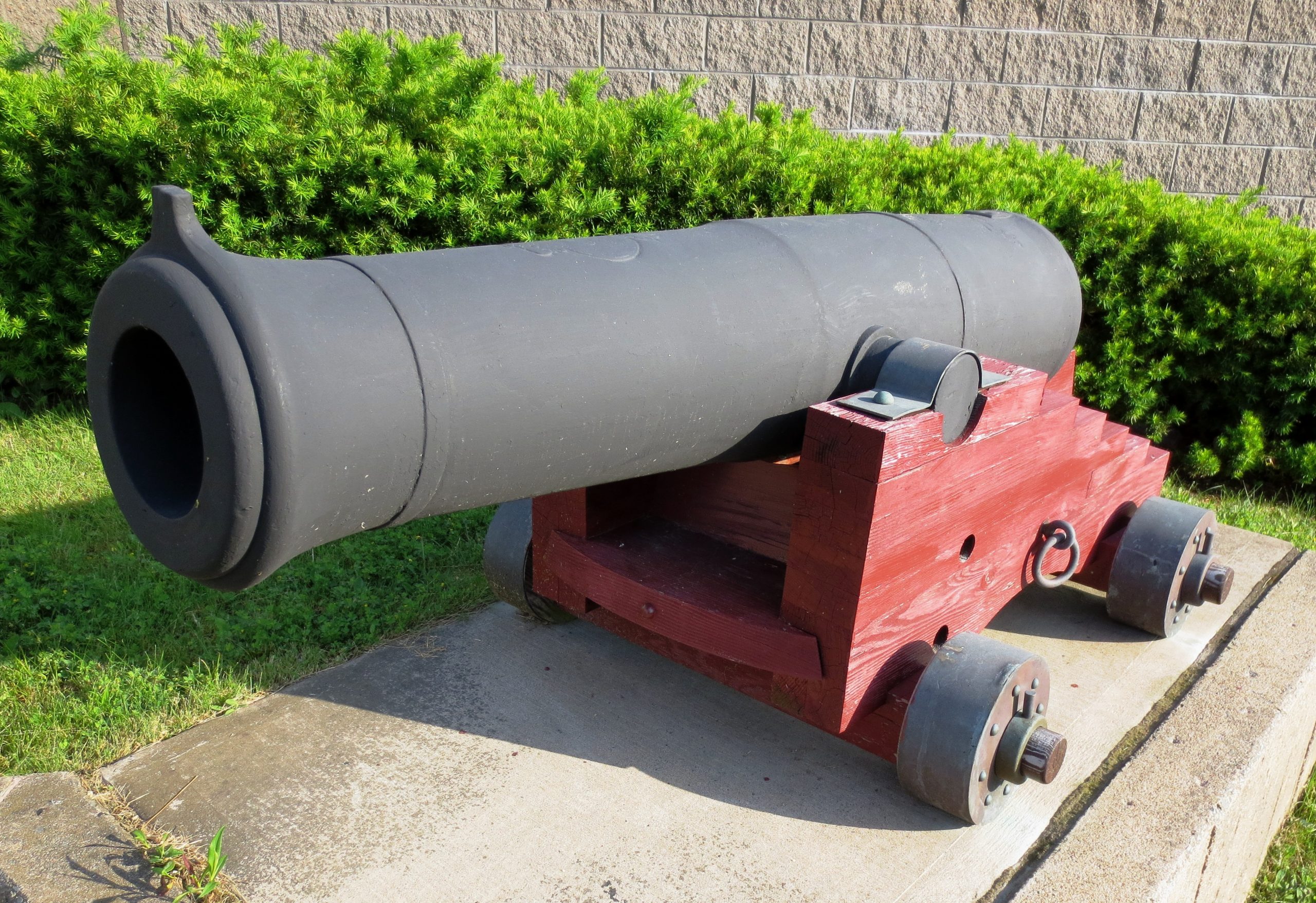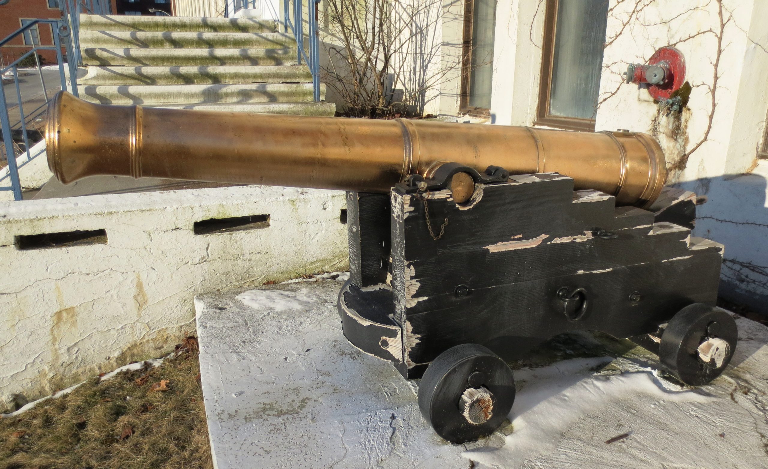 Blomefield Cast Iron 32-pounder 56-cwt Smoothbore Muzzleloading Gun (TBC), 5-½ inch bore, heavily corroded, King George III cypher, recovered from Halifax harbour. Mounted on a wood naval gun carriage, located in front of the central entrance to the Halifax Dockyard.