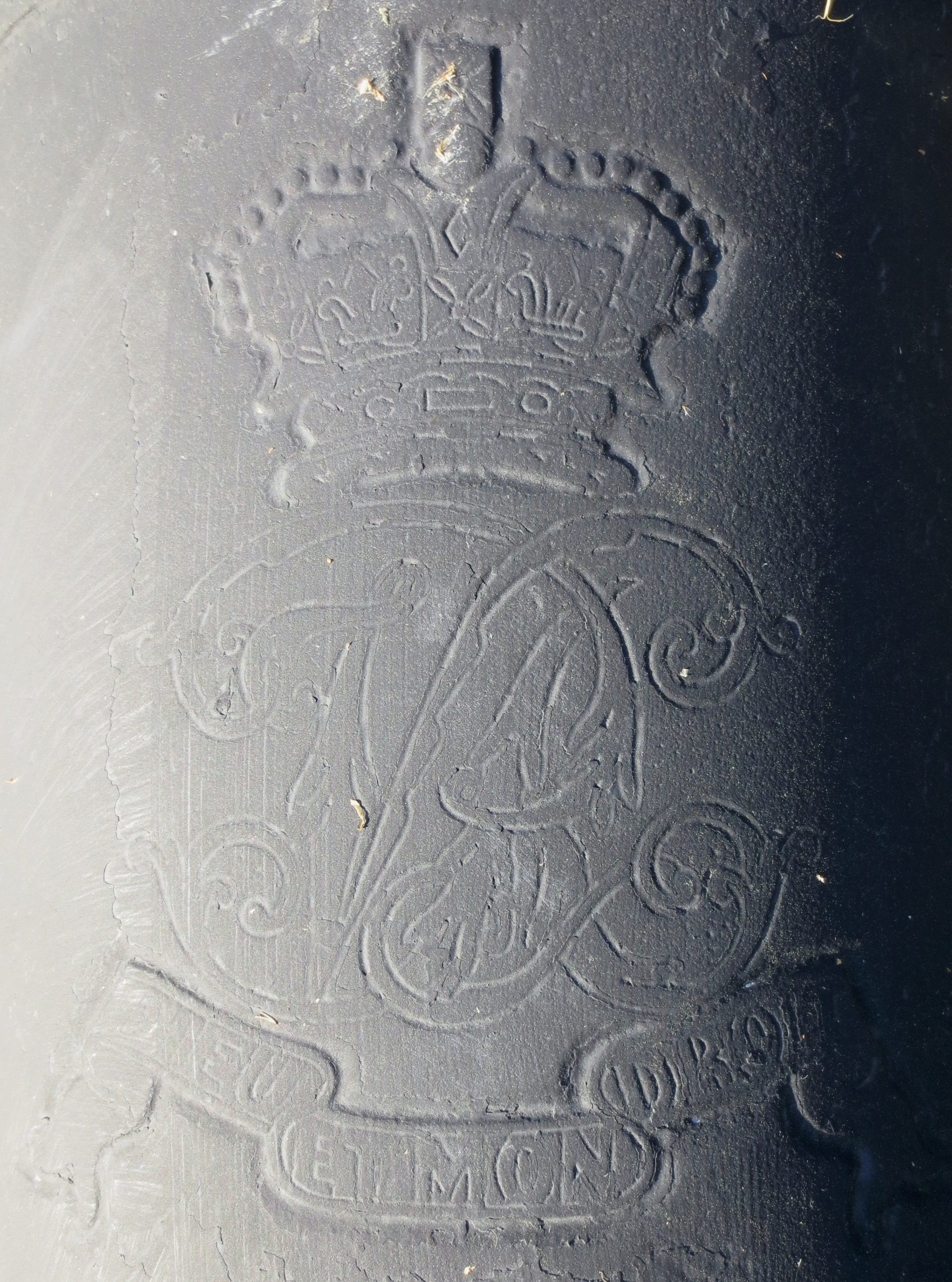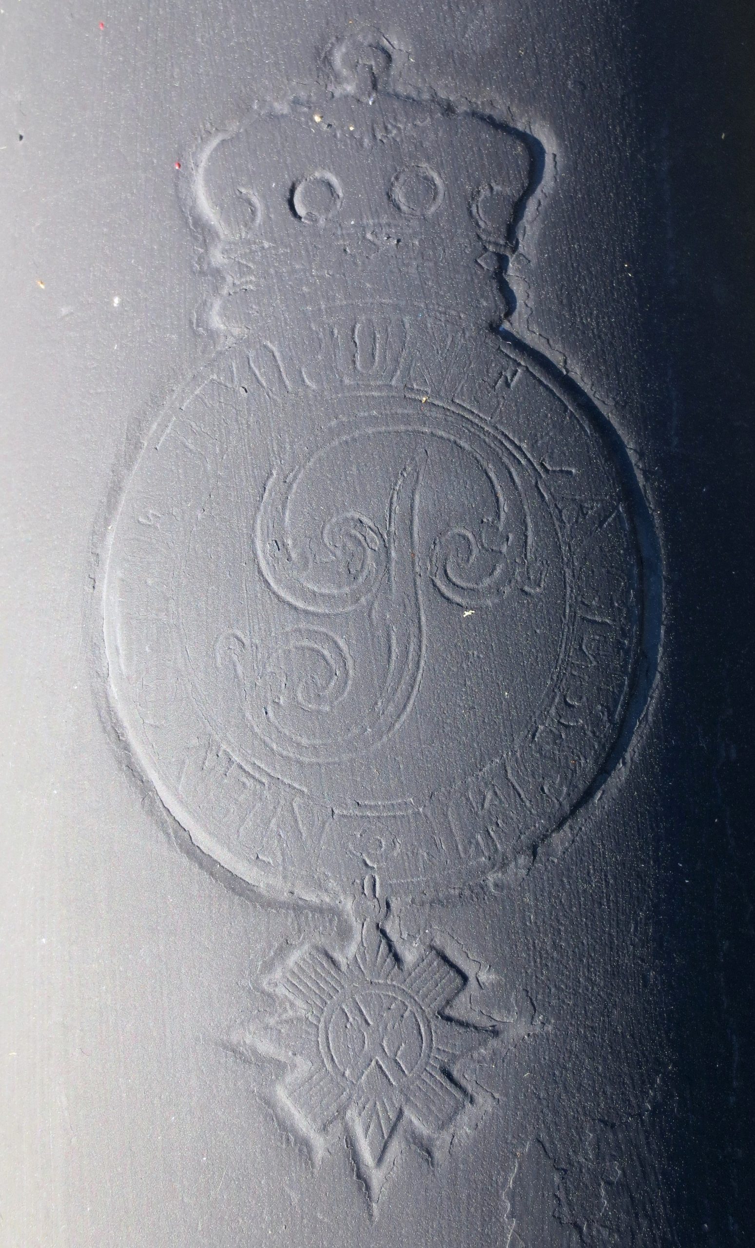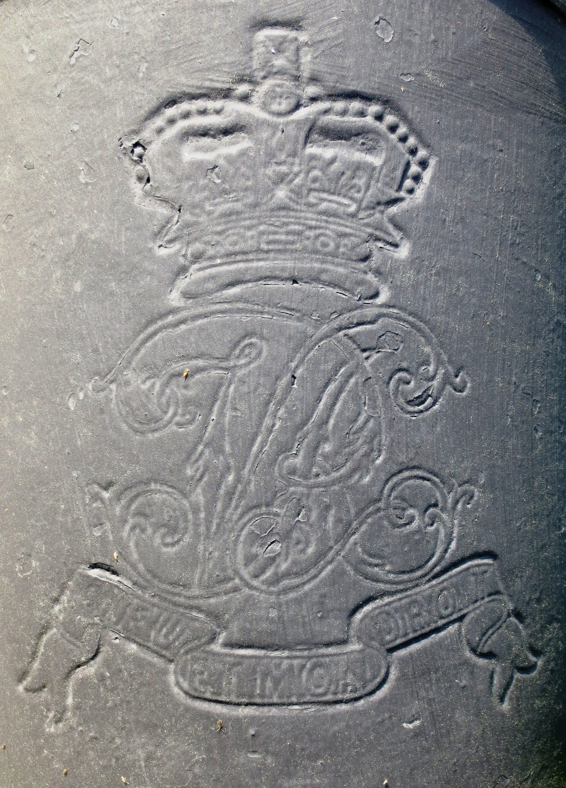 Blomefield Cast Iron Smoothbore Muzzleloading Gun, 3-inch bore, broad arrow mark, Queen Victoria cypher and the cypher for the Master General of the Ordnance (Major General Jonathan Peel, 12 October 1799 – 13 February 1879), mounted on a wood naval gun carriage. No. 2 beside the main entrance to HMC Dockyard.