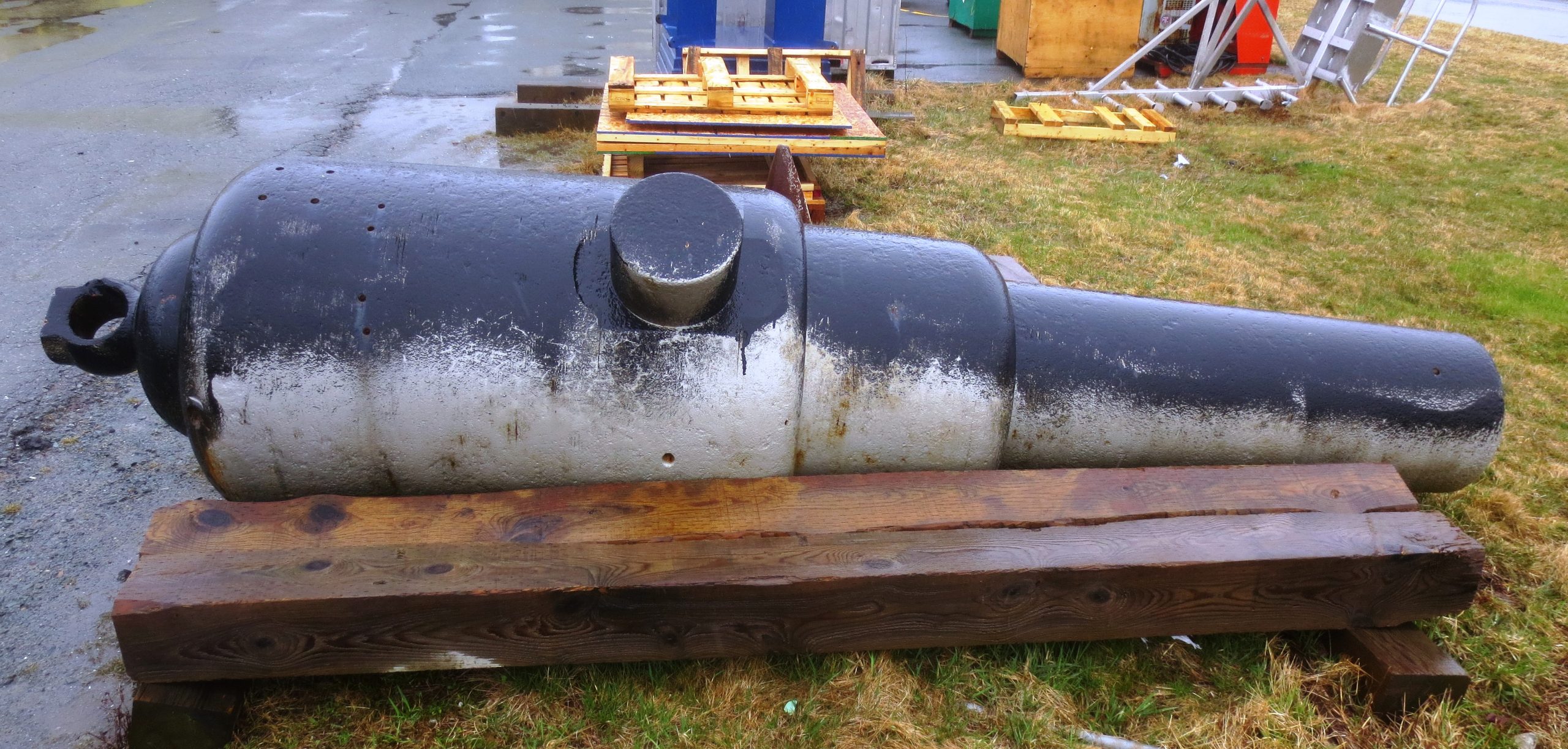 9-inch 12-ton Mk. I Muzzleloading Rifle with Millar pattern breeching ring, No. 1, on wood blocks on the ground. This gun is one of four recovered from a burial site in front of the Halifax Armoury, restored by the Fleet Diving Unit, Atlantic. It is planned for it to be on display with the FDU (A).