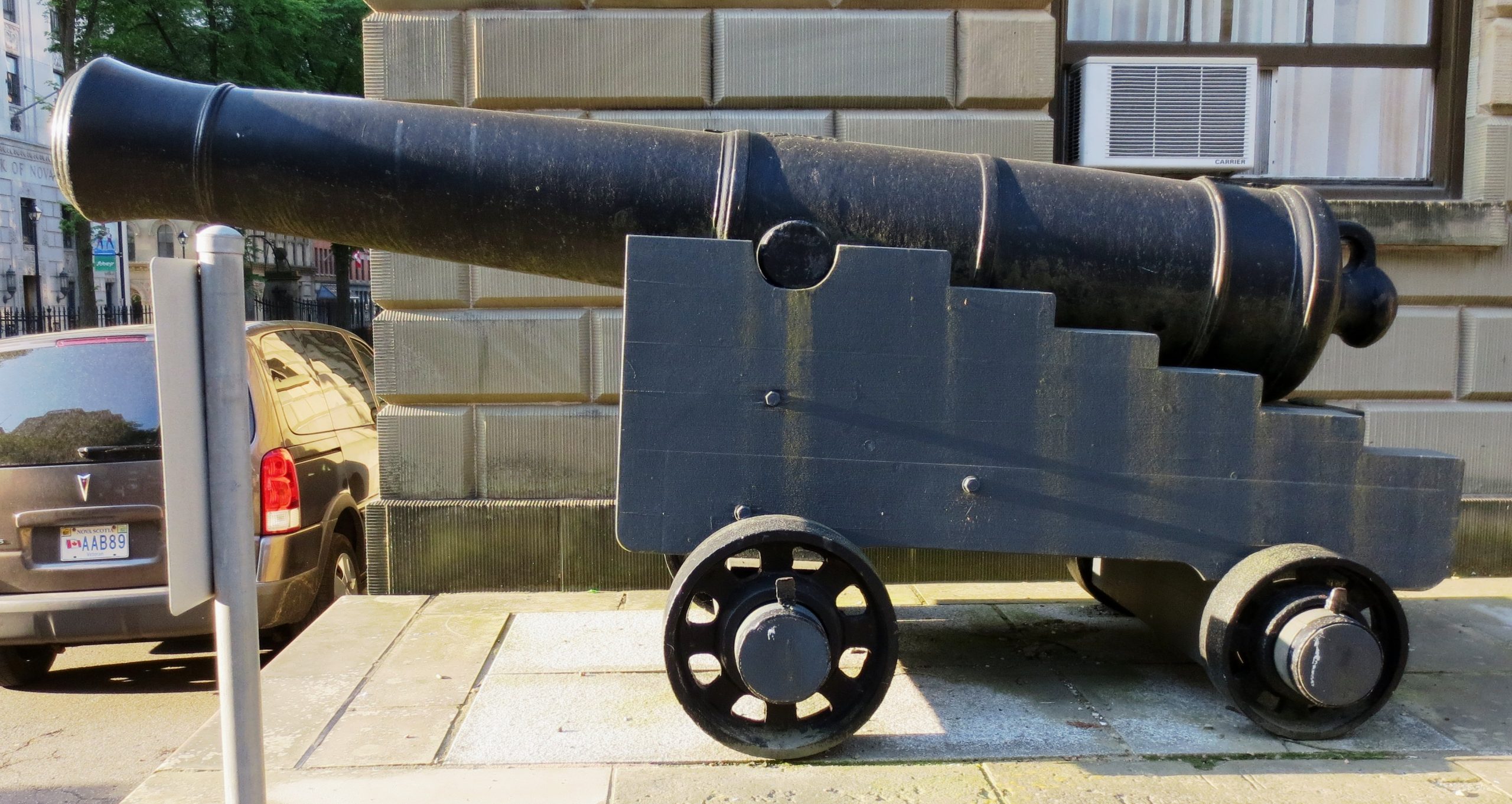 Cast Iron possible 12-pounder Smoothbore Muzzleloading Gun, no cypher, no markings, mounted on a wooden naval gun carriage on the East side of the Provincial Legislative Building. This gun was taken as a war prize from the USS Chesapeake in the War of 1812.