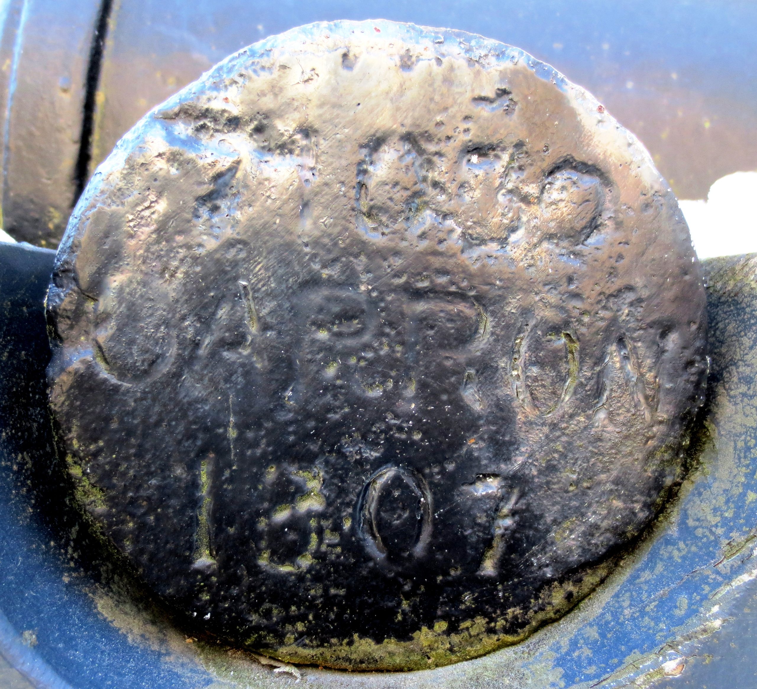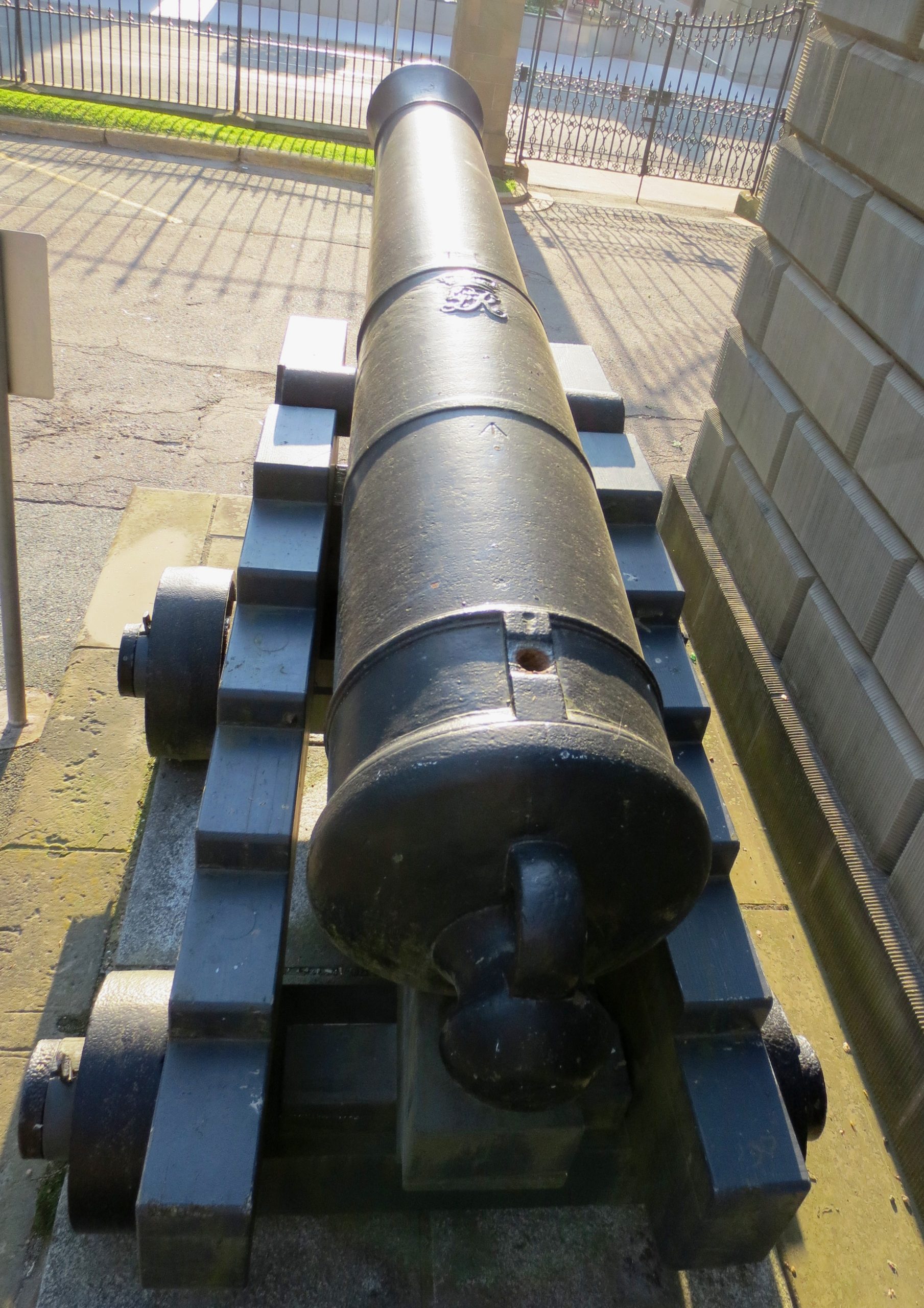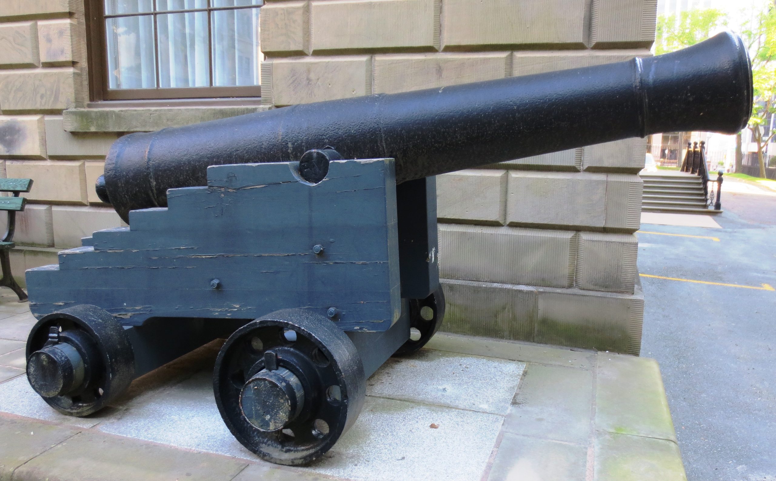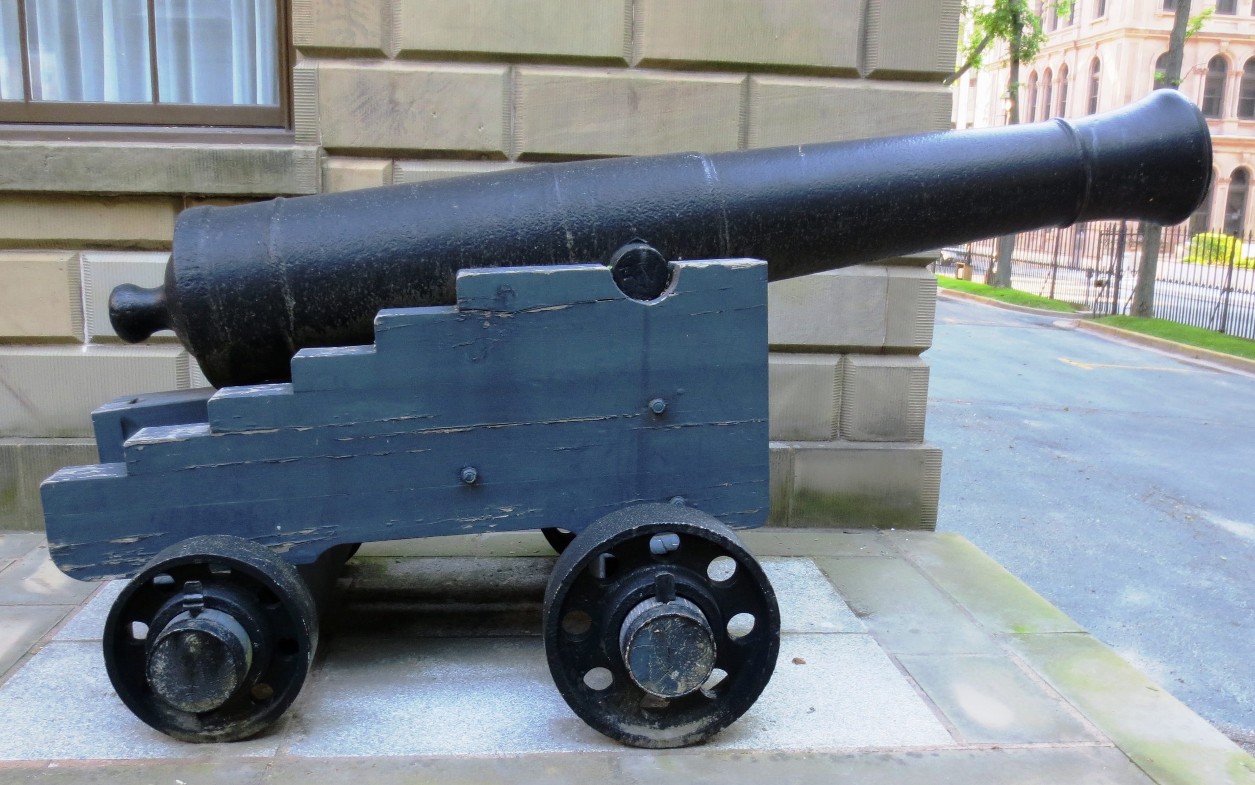 Blomefield Cast Iron 12-pounder Smoothbore Muzzleloading Gun, weight corroded, under the cascabel, The Carron Company of Falkirk, Scotland (Serial No. corroded, CARRON, 1807) on the left trunnion, King George III cypher, mounted on a wooden naval gun carriage on the West side of the Provincial Legislative Building. This gun came from HMS Shannon which fought and captured USS Chesapeake in the War of 1812.