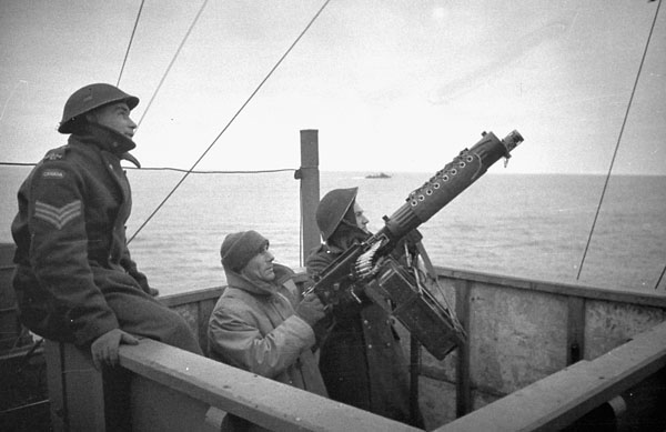 A Canadian machine gun crew aboard His Majesties Troopship (HMT) Empress of Canada, taking part in Operation GAUNTLET, the Spitsbergen raid, en route to Spitsbergen, ca. 19-24 August 1941.