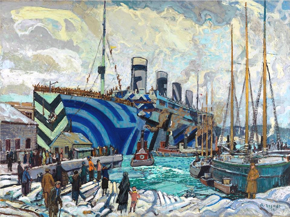 War artist Arthur Lismer captured the return of the troopship RMS Olympic to Halifax harbour following the First World War. RMS Olympic‘s multi-coloured dazzle camouflage, added in 1917 at the height of the German U-Boat threat, was intended to make the ship more difficult to identify and target.  The painting also provides a glimpse of the busy Halifax dockyard, Canada’s principal First World War naval base.  Pressed into service in 1915, RMS Olympic became one of the war’s most famous troop ships.  Affectionately known as “Old Reliable,” Olympic would carry over 200,000 British, American, and Canadian troops to and from the fighting fronts.
