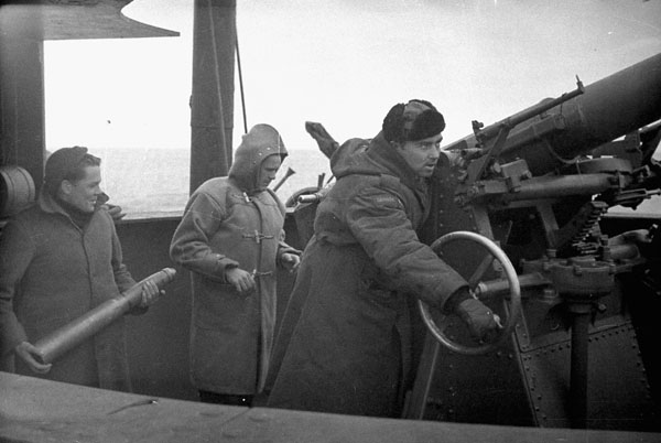 A Canadian crew aboard His Majesty’s Troopship (HMT) Empress of Canada, taking part in Operation GAUNTLET, the Spitsbergen raid, en route to Spitsbergen, ca. 19-24 August 1941.