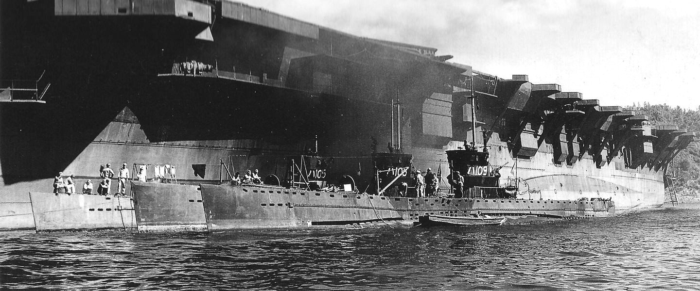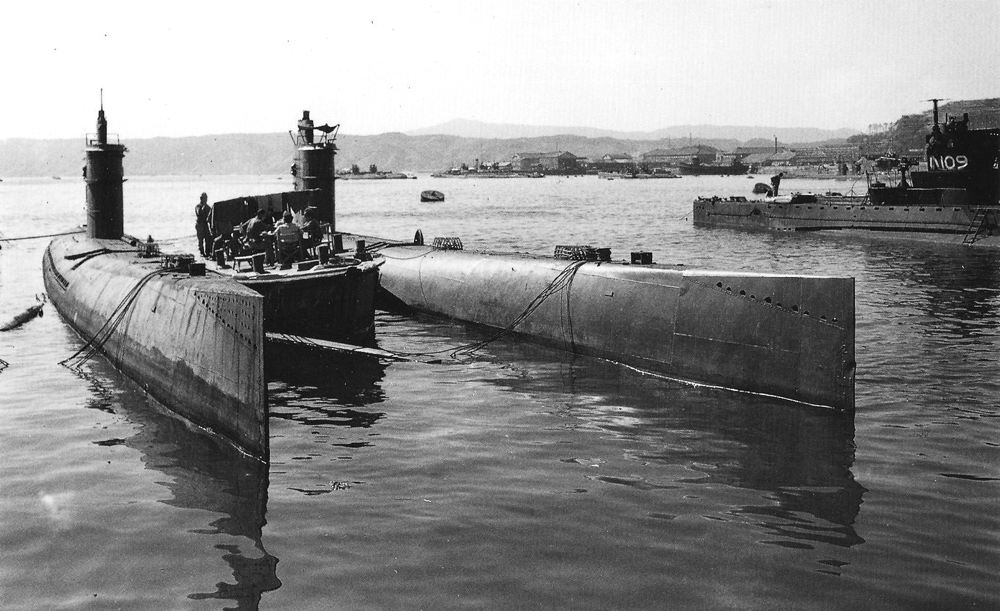 Ha-101-class transport submarines Ha-105, Ha-106 and Ha-109, 1945. 370 tonnes. They are tied up alongside the Imperial Japanese Navy aircraft carrierIbukiat Sasebo, Japan, in 1945.
