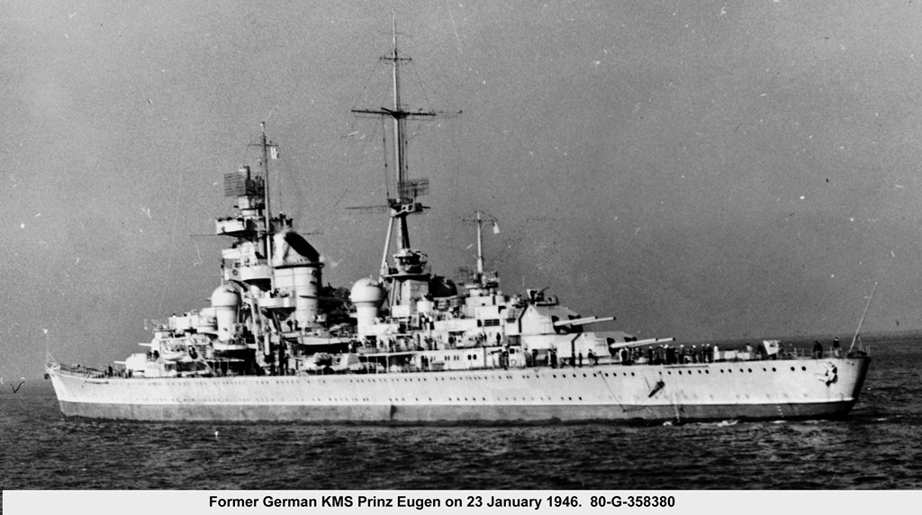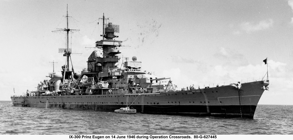 Prinz Eugen was an Admiral Hipper-class heavy cruiser, the third of a class of five vessels. She served with Germany’s Kriegsmarine during the Second World War and was one of the few to survive. The ship was laid down in April 1936, launched in August 1938, and entered service after the outbreak of war, in August 1940. She was named after Prince Eugene of Savoy, an 18th-century general in the service of Austria. She was armed with a main battery of eight 20.3-cm (8-inch) guns and, although nominally under the 10,000-long-ton (10,160 t) limit set by the Anglo-German Naval Agreement, actually displaced over 16,000 long tons (16,257 t).Prinz Eugen saw action during Operation Rheinübung, an attempted breakout into the Atlantic Ocean with the battleship Bismarck in May 1941. The two ships destroyed the British battlecruiser HMS Hood and moderately damaged the battleship HMS Prince of Wales in the Battle of the Denmark Strait. Prinz Eugen was detached from Bismarck during the operation to raid Allied merchant shipping, but this was cut short due to engine troubles. After putting into occupied France and undergoing repairs, the ship participated in Operation Cerberus, a daring daylight dash through the English Channel back to Germany. In February 1942, Prinz Eugen was deployed to Norway, although her time stationed there was curtailed when she was torpedoed by the British submarine HMS Trident days after arriving in Norwegian waters. The torpedo severely damaged the ship’s stern, which necessitated repairs in Germany.Upon returning to active service, the ship spent several months training officer cadets in the Baltic before serving as artillery support for the retreating German Army on the Eastern Front. After the German collapse in May 1945, she was surrendered to the Royal Navy before being transferred to the US Navy as a war prize. After examining the ship in the United States, the US Navy assigned the cruiser to the Operation Crossroads nuclear tests at Bikini Atoll. Having survived the atomic blasts, Prinz Eugen was towed to Kwajalein Atoll, where she ultimately capsized and sank in December 1946. The wreck remains partially visible above the water approximately two miles northwest of Bucholz Army Airfield, on the edge of Enubuj. One of her screw propellers was salvaged and is on display at the Laboe Naval Memorial in Germany.  (Wikipedia)