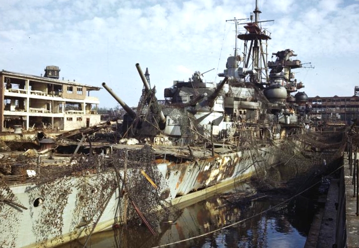 Kriegsmarine Heavy Cruiser Admiral Hipper, as found by Canadian troops when they entered the ruins of Kiel in North West Germany. The warship was in dry dock at Kiel when the harbour was captured by the Allies. Both the German attempts to camouflage her and the damage caused by Allied bombers can be seen.