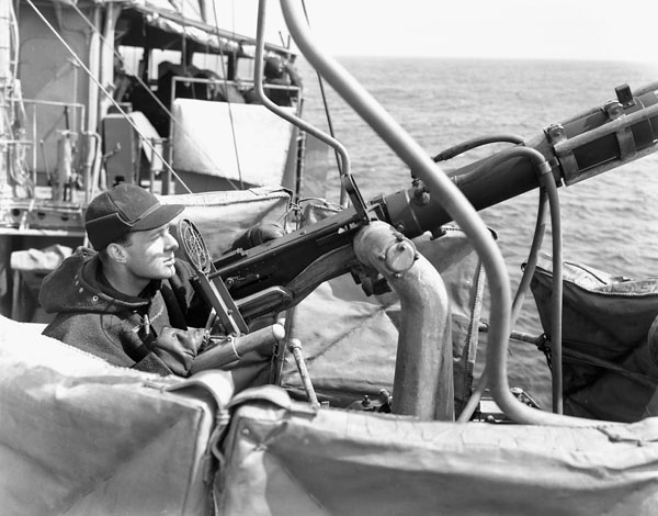 RCN rating manning a .50-calibre machine gun aboard HMCS St Croix at sea, March 1941.