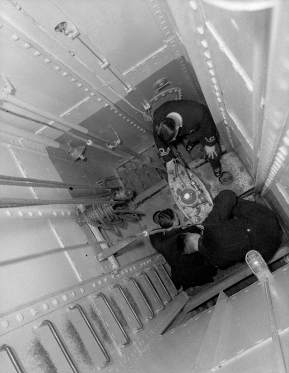 Officers examining Asdic installation in HMCS Acadia, November 1940.