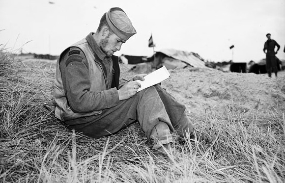 Royal Canadian Navy Beach Commando “W”, Able Seaman George Vilneff, W-1 Party, writing a letter in the Juno sector of the Normandy beachhead, France, 20 July 1944.