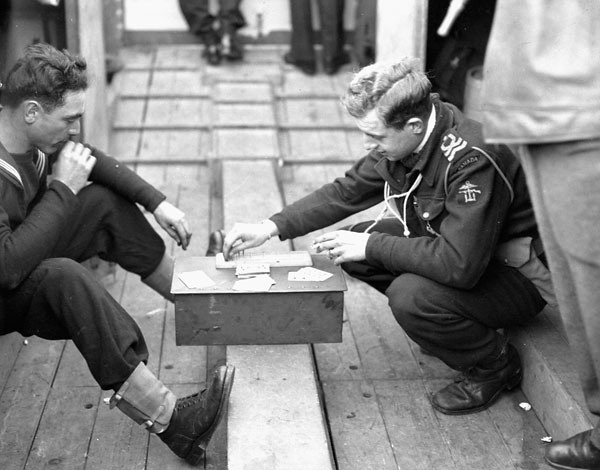 Royal Canadian Navy Beach Commando Lieutenant John Beveridge (right) playing cribbage aboard the infantry landing ship HMCS Pince David during a training exercise off the coast of England, 9 May 1944.