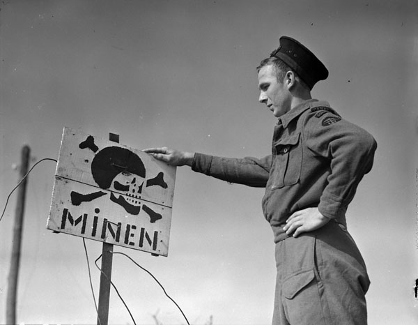 Royal Canadian Navy Beach Commando Able Seaman Douglas F. Trewin, W-2 Party, points out a German sign warning of mines in the Juno sector of the Normandy beachhead, France, 20 July 1944.