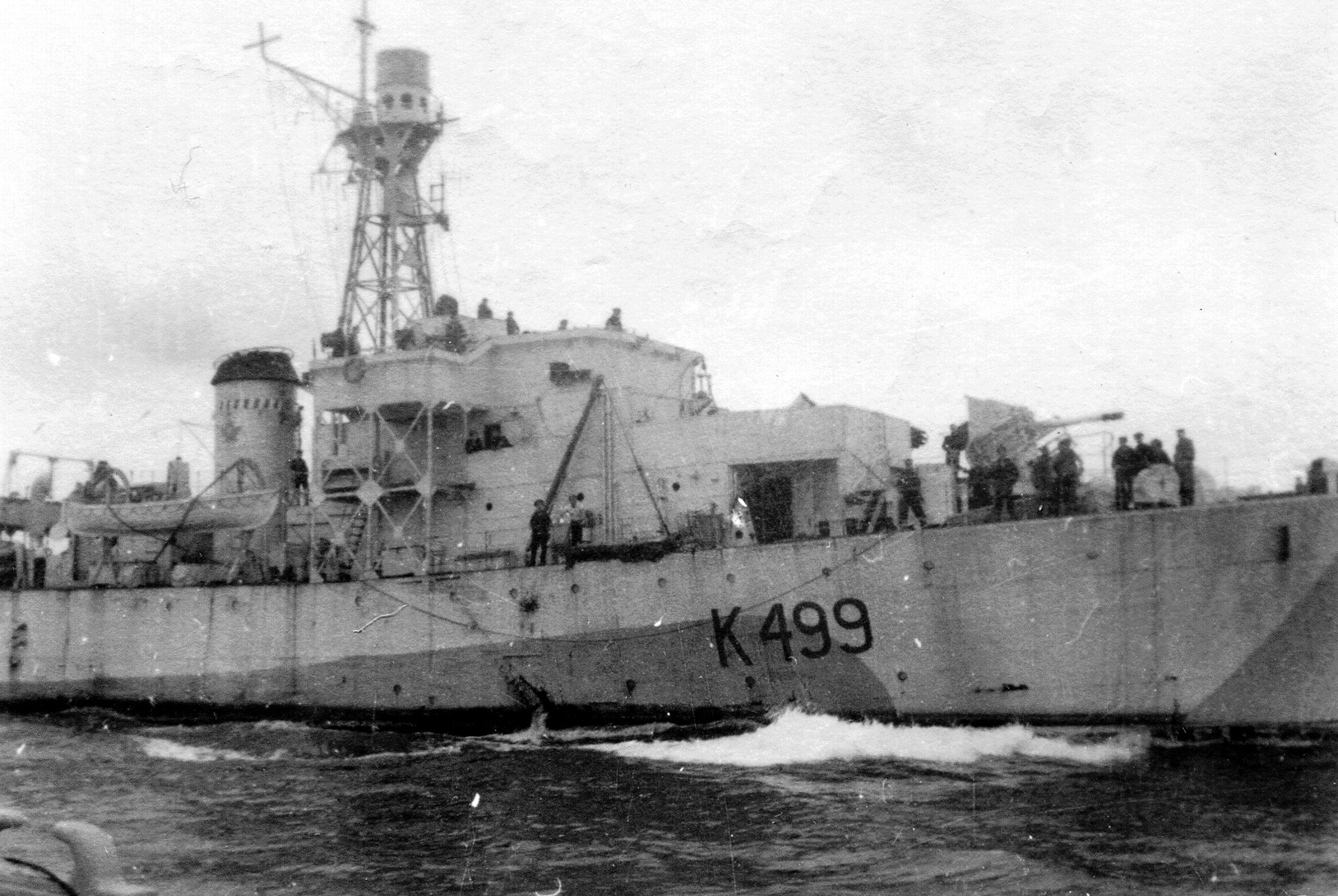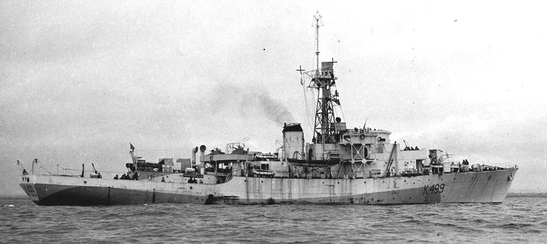 HMCS Huntsville (K499) Castle class Corvette. Built by Ailsa Shipbuilding Co. Ltd., Troon, Scotland, she was laid down and launched as HMS Woolvesey Castle K461. On completion she was transferred to the RCN and commissioned as HMCS Huntsville on 6 Jun 1944, on the Clyde. She worked up at Stornoway early in July and joined EG C-5 at Londonderry later that month, leaving on 11 Aug 1944 for ONS.248, her first convoy. In Nov 1944 Huntsville missed a convoy while under repair in Halifax and acted as local escort to one convoy from St. John’s to New York – seemingly the only ship of her class to visit there. Rejoining the Atlantic convoy cycle in Dec 1944, she left Londonderry for the last time on 16 Apr 1945, to meet ON.297. In May 1945 she commenced refit at Halifax, completed in Aug 1945, and in Sep 1945 she was placed in reserve. Paid off for disposal on 15 Feb 1946 at Halifax, and sold that year, she entered service in 1947 as SS Wellington Kent. Renamed Belle Isle II in 1951. Following a collision near Trois-Rivieres., Quebec, on 19 Aug 1960, she grounded and burned out.