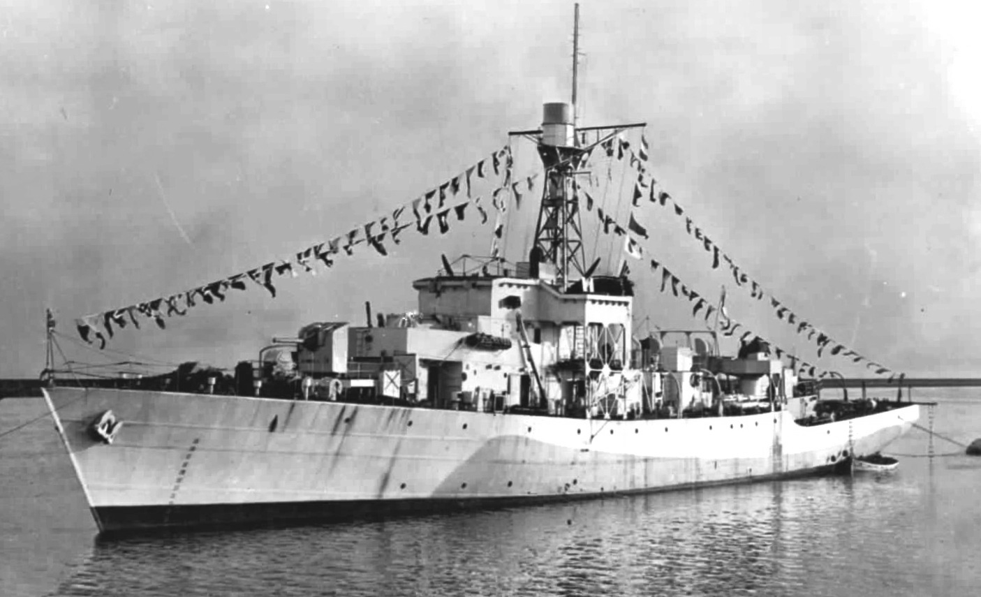 HMCS Kincardine (K490) Castle class Corvette. Laid down and launched as HMS Tamworth Castle, she was, on completion, transferred to the RCN and commissioned at Middlesbrough on 19 June 1944 as HMCS Kincardine. After working up at Tobermory and Stornoway she arrived at Londonderry late in Aug 1944 to join EG C-2 but had to return to her builder’s for repairs. Returning to Londonderry in mid-Sep 1944, she remained on local duties until 02 Oct 1944, when she left to join ON.257, her first convoy. HMCS Kincardine served as an ocean escort for the remainder of the war, leaving ‘Derry for the last time at the beginning of Jun 1945. Briefly allocated to HMCS Cornwallis for training in Jul 1945, she then underwent a minor refit at Liverpool, Nova Scotia. She was placed in maintenance reserve at Halifax in Oct 1945, and then she was paid off there on 27 Feb 1946. Later that year she was sold to the French government and resold in 1947 to Moroccan interests, to be renamed Saada.