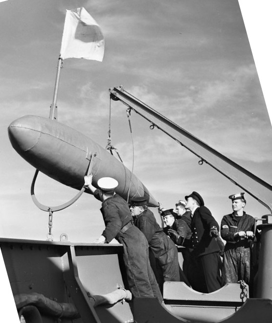 HMCS Alberni (K103) Flower class Corvette, RCN crew preparing to launch a minesweeping float, off the BC coast, March 1941.