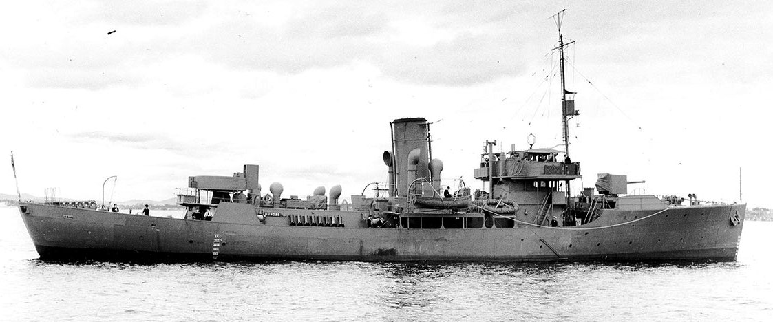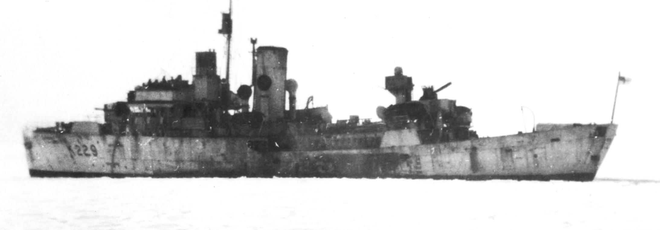 HMCS Dundas (K229) Flower class Corvette, 25 July 1941. Built at Victoria and commissioned on 1 Apr 1942, she joined Esquimalt Force after working up, and in Aug 1942 made a round trip as convoy escort to Kodiak, Alaska, in support of the Aleutian campaign. On 13 Sep 1942 she sailed for the east coast to replace an Operation “Torch” nominee, joining WLEF upon arrival at Halifax on 13 Oct 1942. She served with EG W-7 from Jun 1943, with W-5 from Sep 1943, and with W-4 from Apr 1944. In the course of a major refit at Montreal from 13 Jun to 19 Nov 1943, HMCS Dundas acquired her extended fo’c’s’le. She commenced another long refit early in Jan 1945, at Liverpool, NS, resuming service in Apr 1945. Paid off on 17 Jul 1945 at Sorel, she was sold later that year and broken up in 1946 at Hamilton, Ontario.