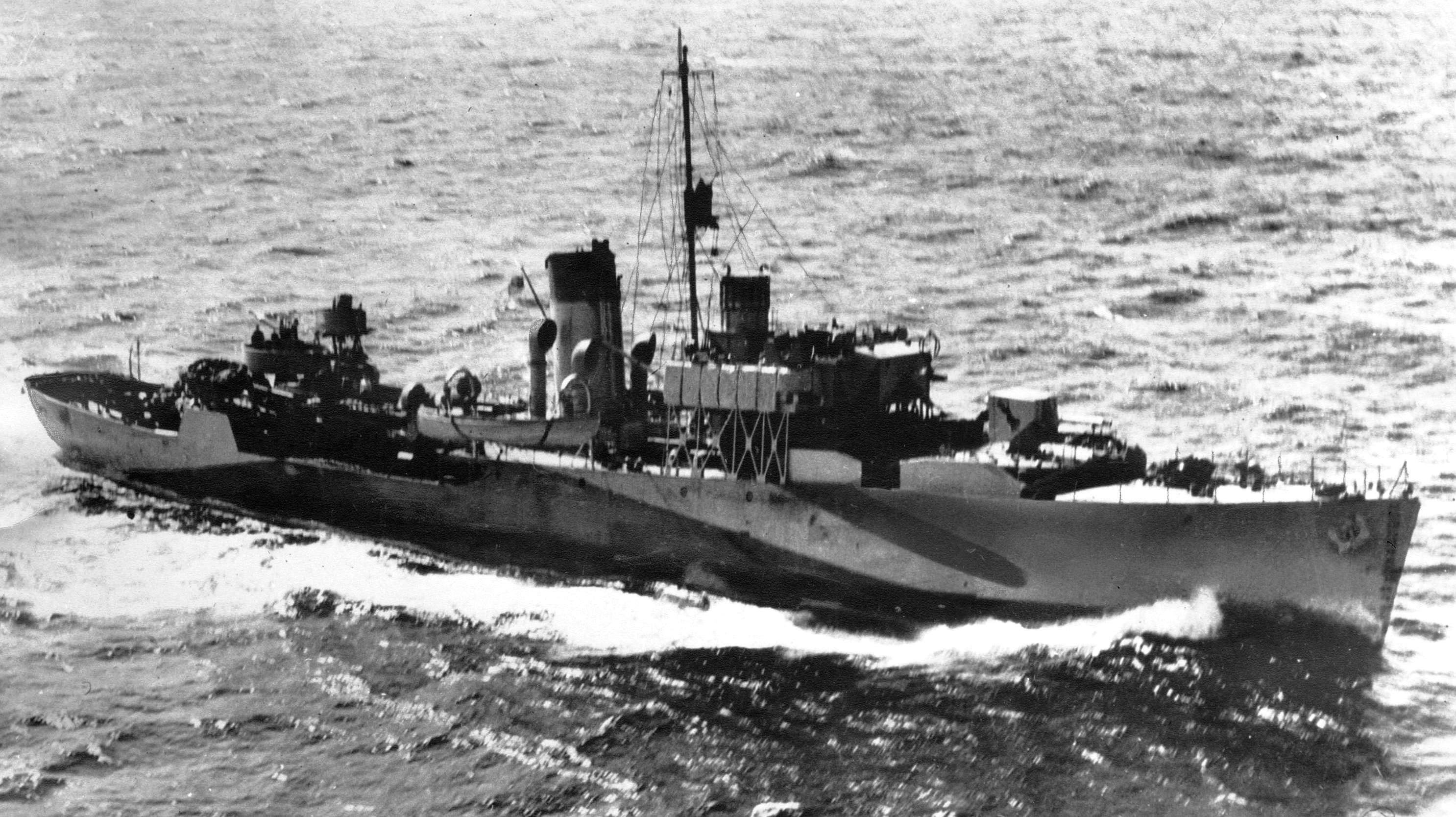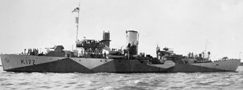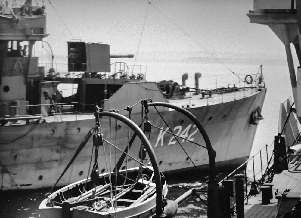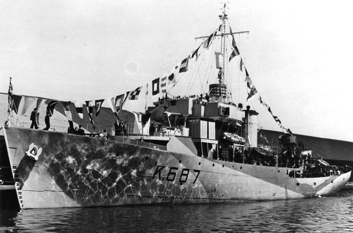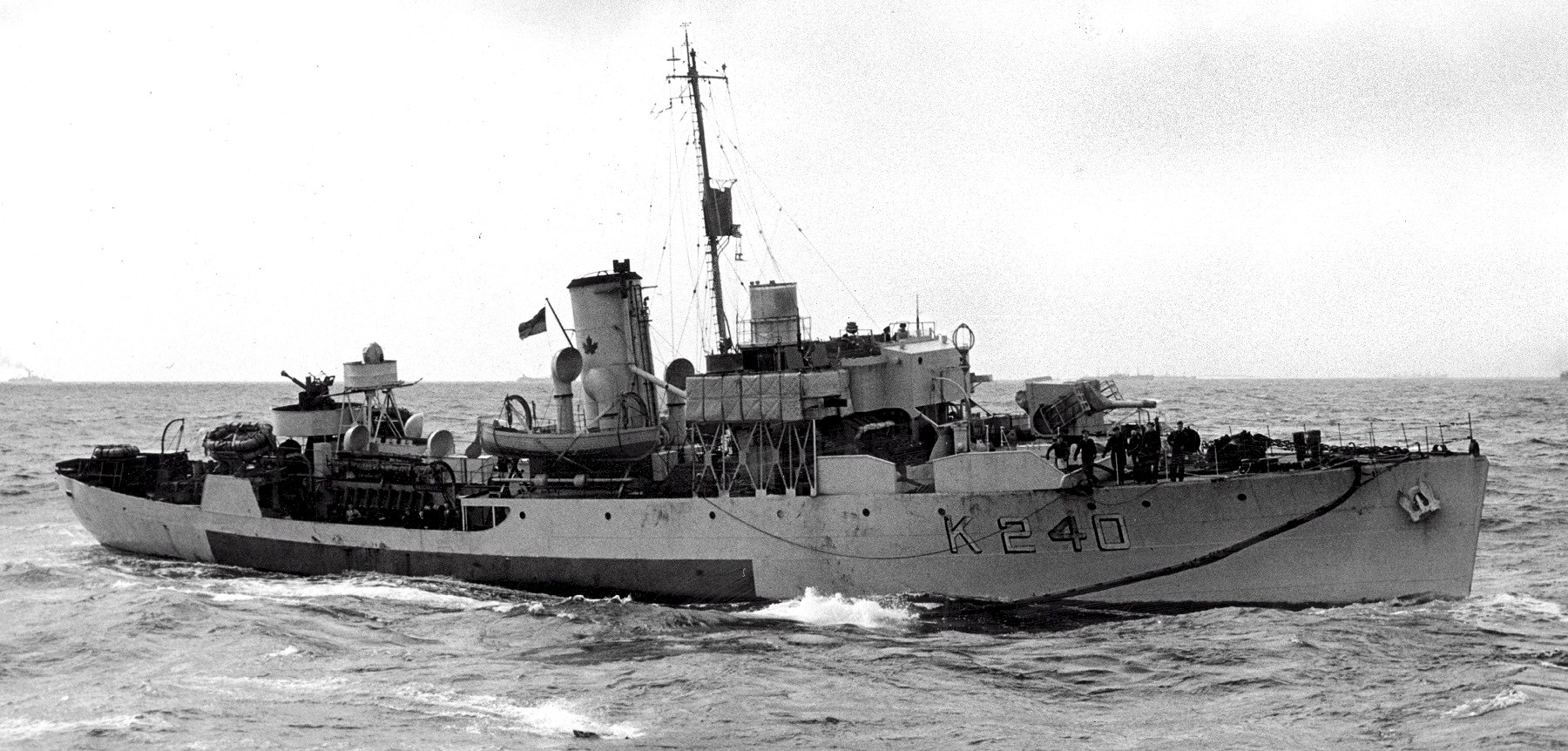 HMCS Vancouver (K240) Flower class Corvette. It appears to have a fueling hose for the astern (of the tanker) method of refueling at sea, rather than the more usual abeam procedure.