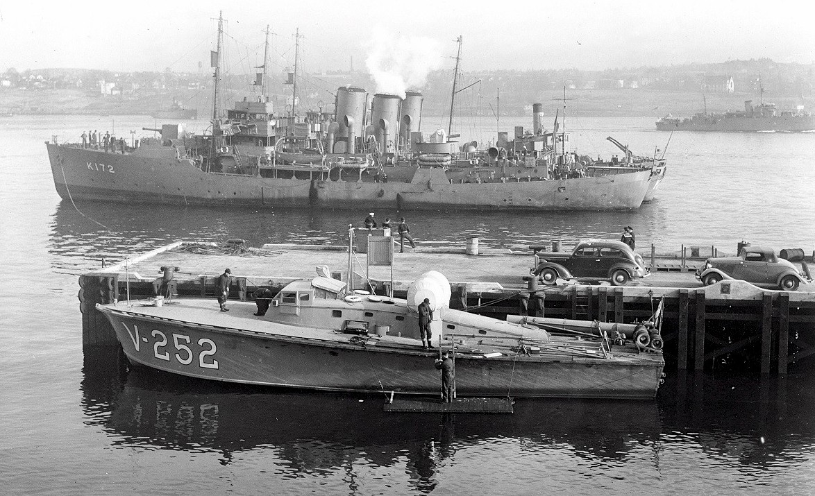 HMCS Trillium (K172) Flower class Corvette, and MTB V-252, at Jetty No. 5 on Halifax side of the Narrows.  Built at Montreal for the RN, she was commissioned at there on 31 Oct 1940 as HMS Trillium.  She arrived at Halifax on 14 Nov 1940 and in the Clyde on 20 Dec 1940 for final fitting out at Greenock, which was completed on 3 Mar 1941.  In Apr 1941, after three weeks’ workups at Tobermory, she joined EG 4 (RN), Greenock, for outbound North American convoys.  On 15 May 1941, HMS Trillium was transferred to the RCN and commissioned as HMCS Trillium.  She left Aultbea on 10 Jun 1941 with OB.332 for St. John’s to join Newfoundland Command.  After two round trips to Iceland she arrived at Halifax on 28 Aug 1941 for three months’ refit there and at Lunenburg.  On completion of the refit in Dec 1941 she made one further round trip to Iceland and, on 20 Jan 1942, left St. John’s for convoy SC.65 to Londonderry.  After two return trips on the “Newfie-Derry” run she went to Galveston, Texas, for refit from 16 Apr to 23 Jun 1942.  Following workups at Pictou, she resumed mid-ocean service with EG A-3 from Aug 1942 until Apr 1943, when she arrived at Boston for a refit that included the extension of her fo’c’s’le.  This was completed on 27 Jun 1943, after which she worked up at Pictou before joining EG C-4.  Late in Apr 1944 she returned to Pictou for a two-month refit, followed by additional repairs at Halifax, and early in Aug 1944 went to Bermuda to work up.  She arrived at St. John’s 2 Sep 1944, to join EG C-3.  On 14 Jan 1945, while escorting the Milford Haven section of ON.278, she sank a coaster in a collision and required five weeks’ repairs, afterward resuming mid-ocean service until the end of the war.  HMCS Trillium was unique in that she spent her entire career as a mid-ocean escort, participating in three major convoy battles: SC.100 (Sep 1942); ON.166 (Feb 1943); and SC.121 (Mar 1943).  She left St. John’s on 27 May 1945, for the UK, where she was returned to the RN at Milford Haven on 27 Jun 1945.  Sold in 1947 for conversion to a whale-catcher, she entered service as the Honduran-registered Olympic Runner in 1950, Otori Maru No. 10 in 1956 and Kyo Maru No. 16 in 1959.  Last in Lloyd’s Register for 1972/1973.
