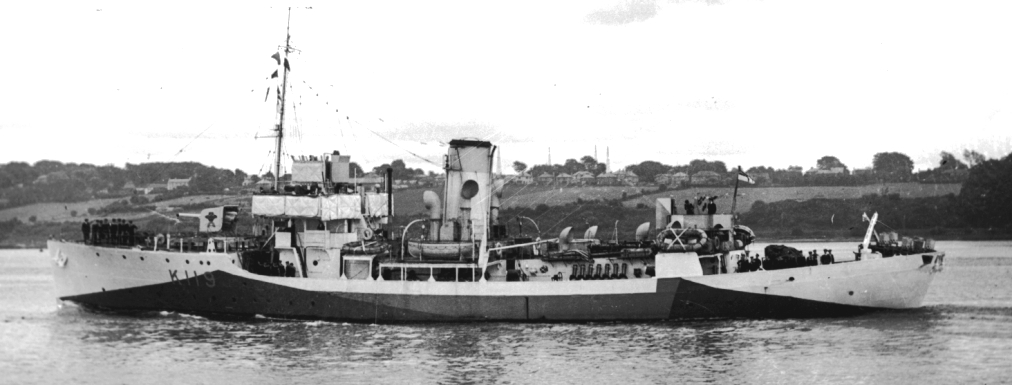 HMCS Orillia (K119) Flower class Corvette. Commissioned 25 Nov 1940, at Collingwood, she arrived at Halifax on 11 Dec 1940 for completion and was assigned to Halifax Local Defence Force until 23 May 1941. HMCS Orillia sailed that day for St. John’s to become one of the seven charter members of the NEF, and for the balance of the year escorted convoys between St. John’s and Iceland. In Sep 1941, she was escort to convoy SC.42, which lost 18 ships. She arrived at Halifax 24 Dec 1941 for a refit, upon completion of which on 22 Mar 1942, she joined EG C-1, leaving St. John’s 02 Apr 1942 with SC.77 for Londonderry. On her arrival she was sent to Tobermory for three weeks’ workups, then returned to the “Newfie-Derry” run until Jan 1944. Orillia took part in major battles around convoys SC.94, which lost 11 ships in Aug 1942 and ON.137 in Oct 1942, which lost only 2 ships despite being heavily attacked. She was a member of EG C-2 from Nov 1942 to May 1944, when she joined EG C-4 following two months’ refit at Liverpool, NS. She left Londonderry for the last time on 16 Jan 1944, to commence a long refit, again at Liverpool, which included the lengthening of her fo’c’s’le. This refit was completed on 3 May 1944, but further repairs were completed at Halifax late in Jun 1944. She arrived in Bermuda on 29 Jun 1944 for three weeks’ workups, on her return joining EG W-2, Western Escort Force, for the duration of the war. Paid off on 02 Jul 1945, at Sorel, she was broken up at Steel Co. of Canada, Hamilton, Ontario, in Jan 1951.