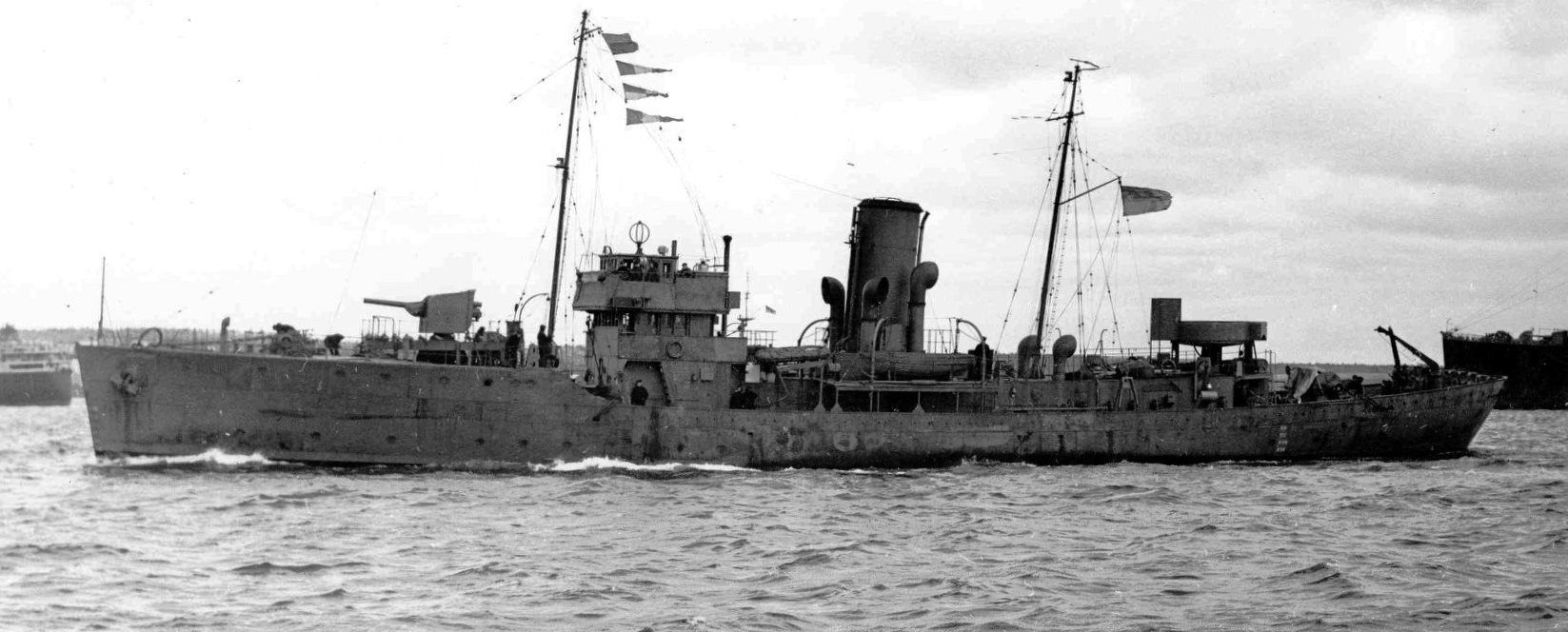 HMCS North Bay (K339) Flower class Corvette. Built at Collingwood, Ontario, she was commissioned there on 25 Oct 1943. HMCS North Bay arrived at Halifax on 29 Nov 1943, and in Dec 1943 carried out workups in St. Margaret’s Bay. On completion of these she was assigned to EG 9, Londonderry, making her passage there as escort to convoy SC.154 early in Mar 1944. When EG 9 became a frigates-only group, HMCS North Bay returned to St. John’s in Apr 1944 and became a member of EG C-4. From 11 Dec 1944 to mid-Feb 1945, she underwent a refit at Sydney and proceeded to Bermuda to work up. On completing this exercise she sailed directly to St. John’s to join EG C-2, but later in Apr 1945 she was transferred to C-3 and, on 30 Apr 1945, left St. John’s to join convoy SC.174 for a final trip to Londonderry. She returned in May 1945 with ON.304 and was paid off on 01 Jul 1945 and laid up at Sorel. In 1946 she was sold for merchant service and became the Bahamian Kent County II; renamed Galloway Kent in 1950; renamed Bedford II in 1951.