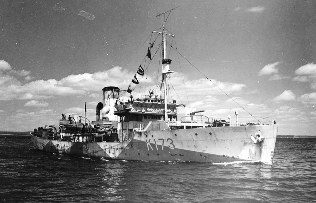 HMCS Weyburn (K173) Flower class Corvette. Commissioned at Montreal on 26 Nov 1941, she arrived at Halifax on 06 Dec 1941 and joined Halifax Force for local escort work, but was soon in need of repairs. These were carried out at Halifax during Mar and Apr 1942, following which she joined WLEF. In Jul 1942 she transferred to Gulf Escort Force for Quebec City-Sydney convoys but in Sep 1942 was allocated to duties in connection with Operation “Torch.” She arrived at Londonderry on 27 Sep 1942 from convoy SC.100, and at Liverpool on 02 Oct 1942 for fitting of Oerlikon A/A guns. The work was completed on 21 Oct 1942 and in Nov 1942, HMCS Weyburn began four months’ employment as escort to UK-Mediterranean convoys. On 22 Feb 1943 HMCS Weyburn was mined off Cape Espartel east of Gibraltar in position 35º46’N, 06º02’W. Twelve members of her crew including her commanding officer were lost with the ship. The mine had been laid by U-118 on 1 Feb 1943.