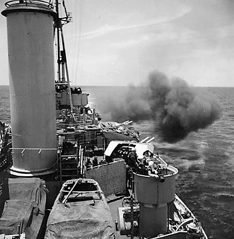 HMCS Uganda (C66) bombarding Sukuma Airfield on Miyako Jima, 4 May 1945.