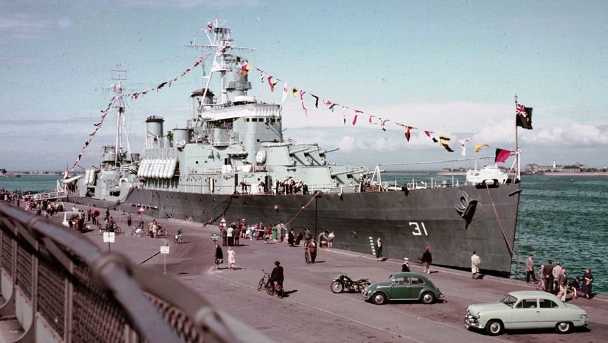HMCS Québec (C31), Copenhagen, Denmark, 1954.