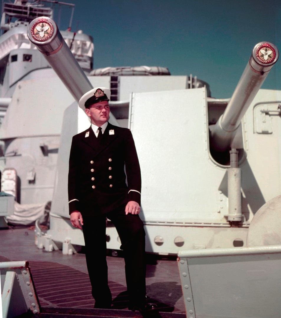 HMCS Ontario (C32), Midshipman B.A. Rogers in front of the warship’s main guns, 1957